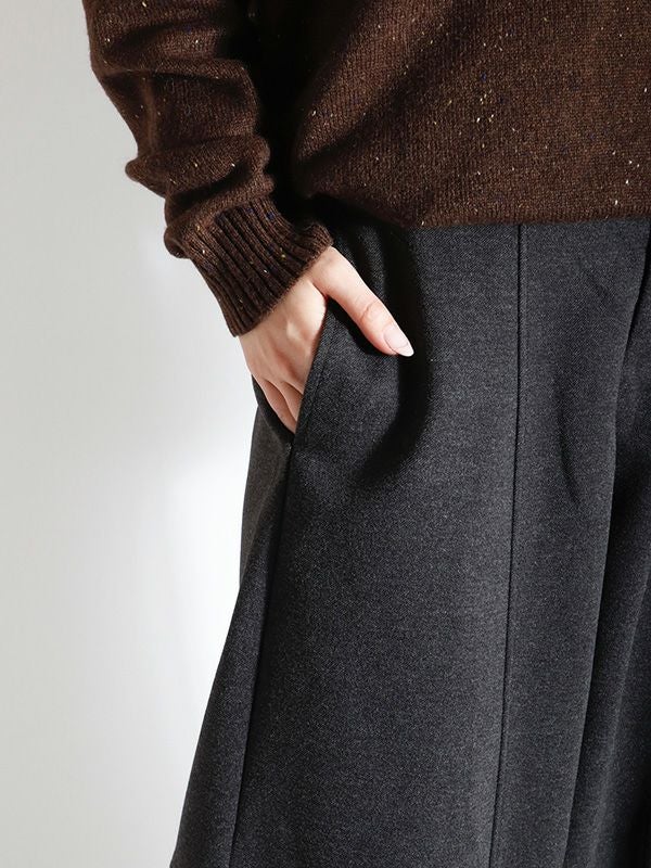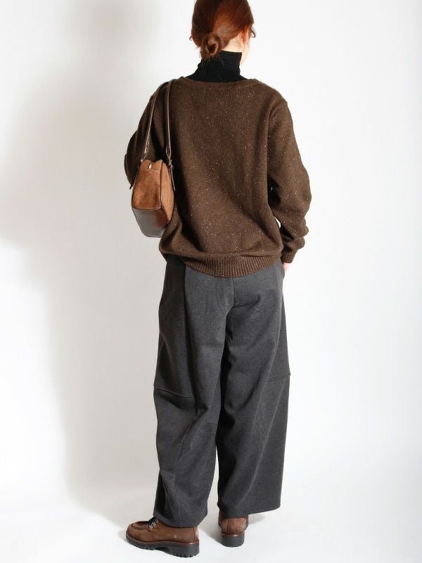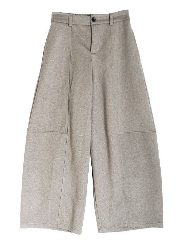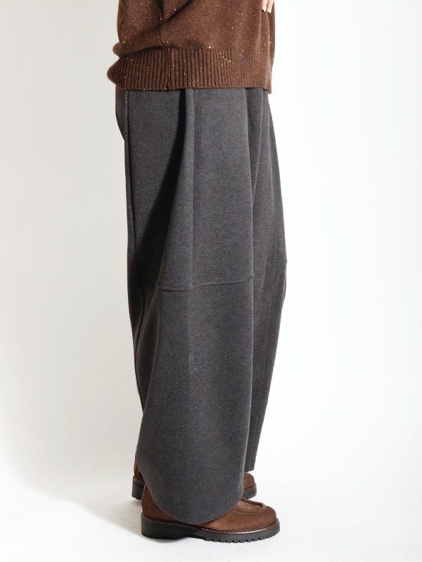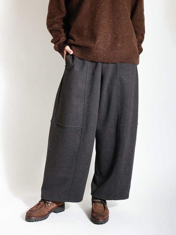 バルーンシルエットが特徴的なパンツ。 厚手の素材を使用することで、独特のシルエットを際立たせています。 ユッタリとしたサイズ感に加え、後ろウエストゴムのリラックス感のある着心地です。温かさ抜群の裏起毛生地を使用しており、冬の寒い時期にもオシャレと寒さ対策も両得。シワになりにくいのも嬉しいポイントです。パンツがゆったりとしたシルエットなので、トップスはコンパクトなサイズ感がおすすめです。 ニットやジャケットなど幅広いアイテムと合わせていただけます。