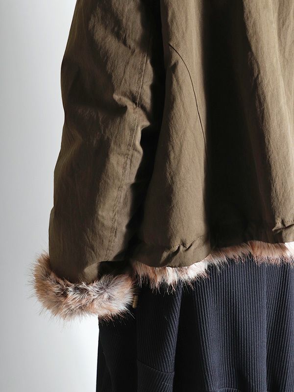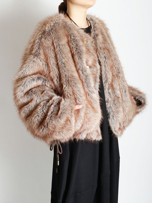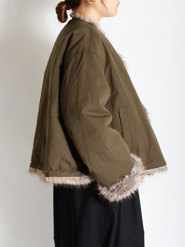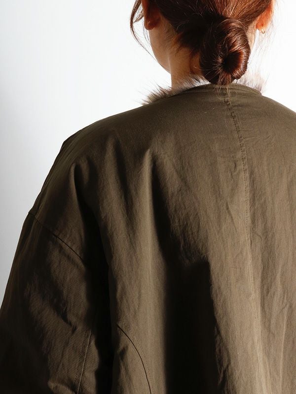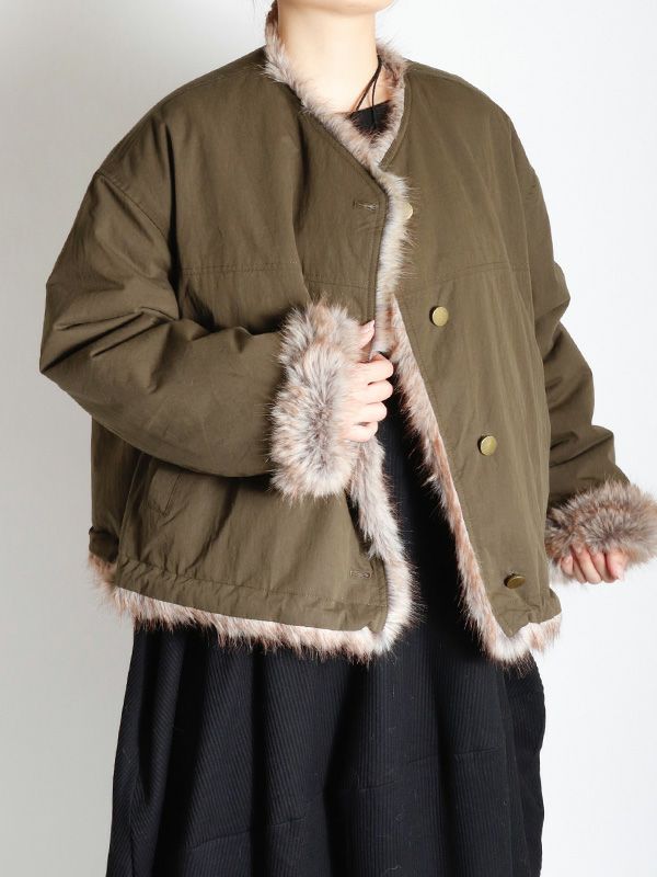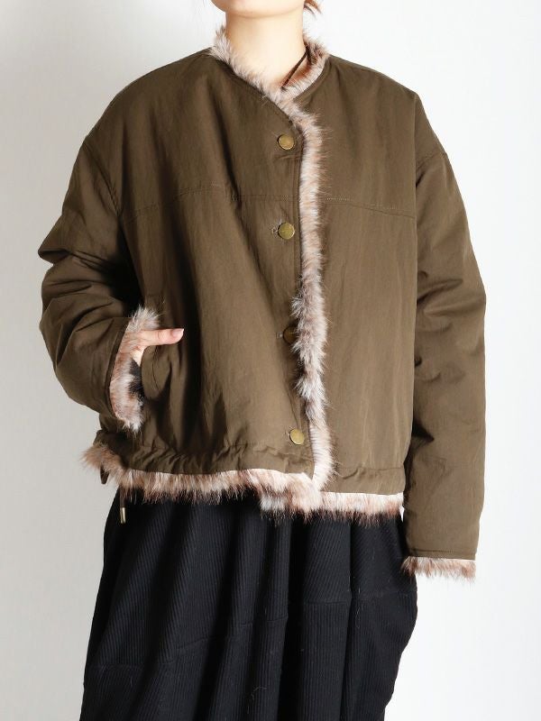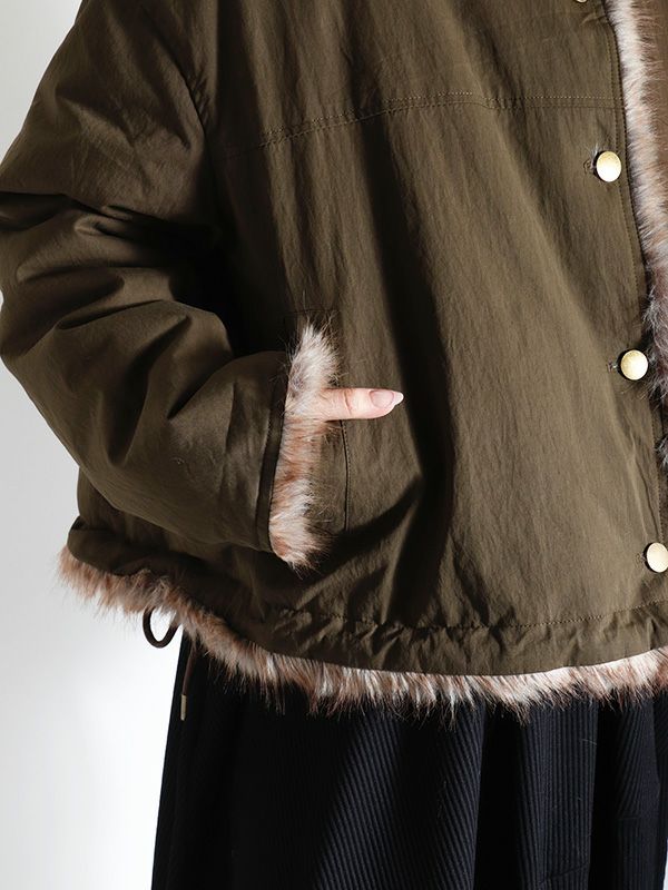 ミンクのような毛並みと、ボリュームのある柔らかな肌触りが魅力のフェイクファーとアクティブな印象のシャリ感のあるノーカラーブルゾンの2つのまったく異なる表情が楽しめるリバーシブルブルゾン。ノーカラーのスッキリとしたネックラインが着用時に抜け感のある動きを生みます。身幅と袖にたっぷりとゆとりを持たせたシルエットにややコンパクトな着丈。裾のストリングでシルエットの調整をしていただけます。