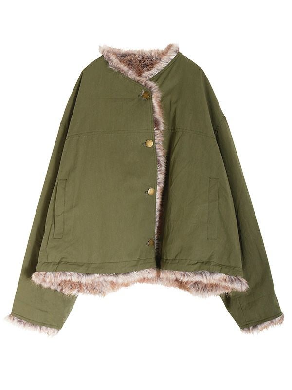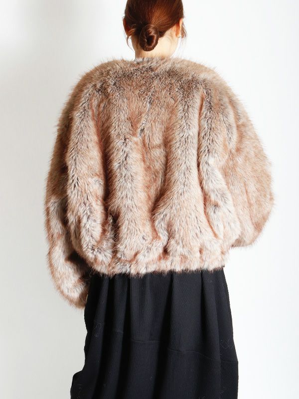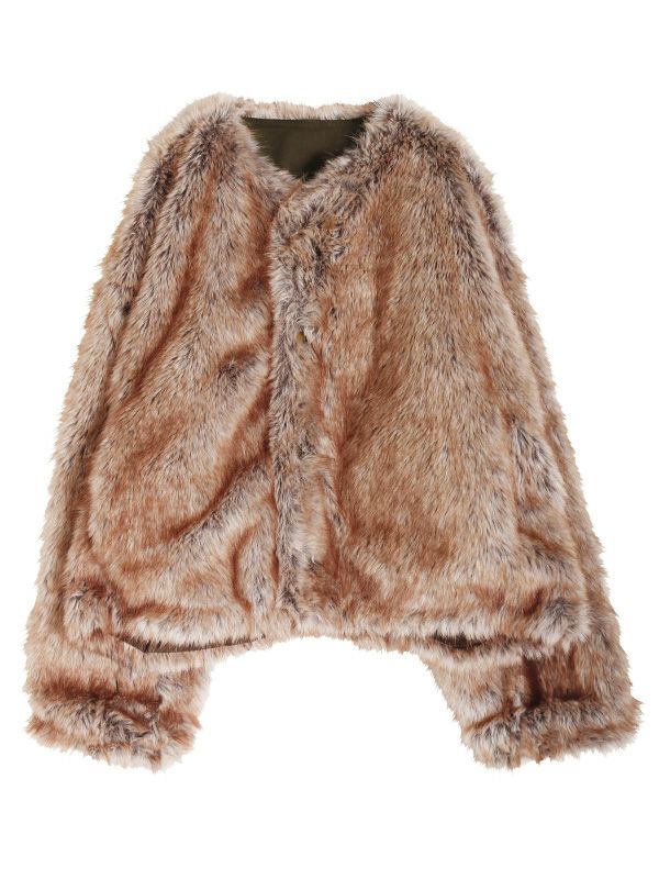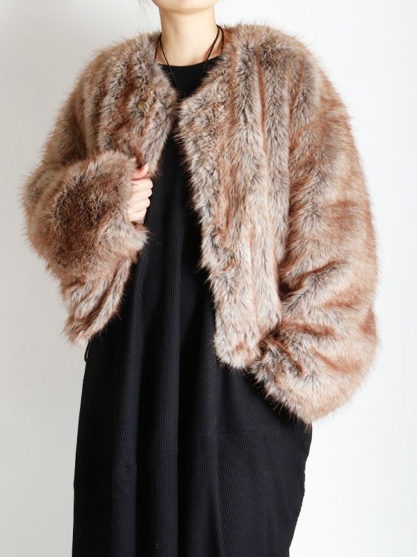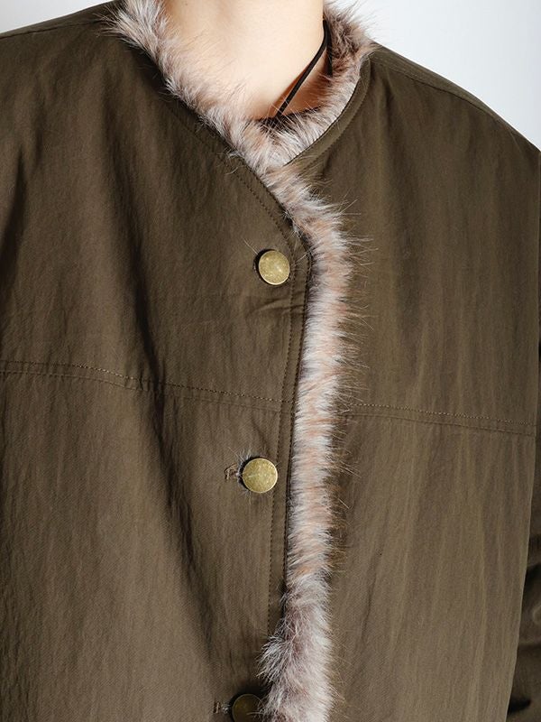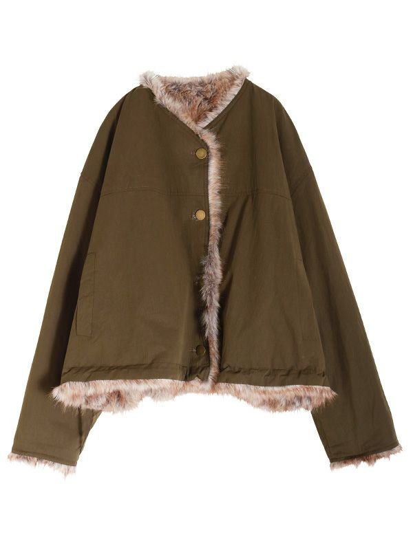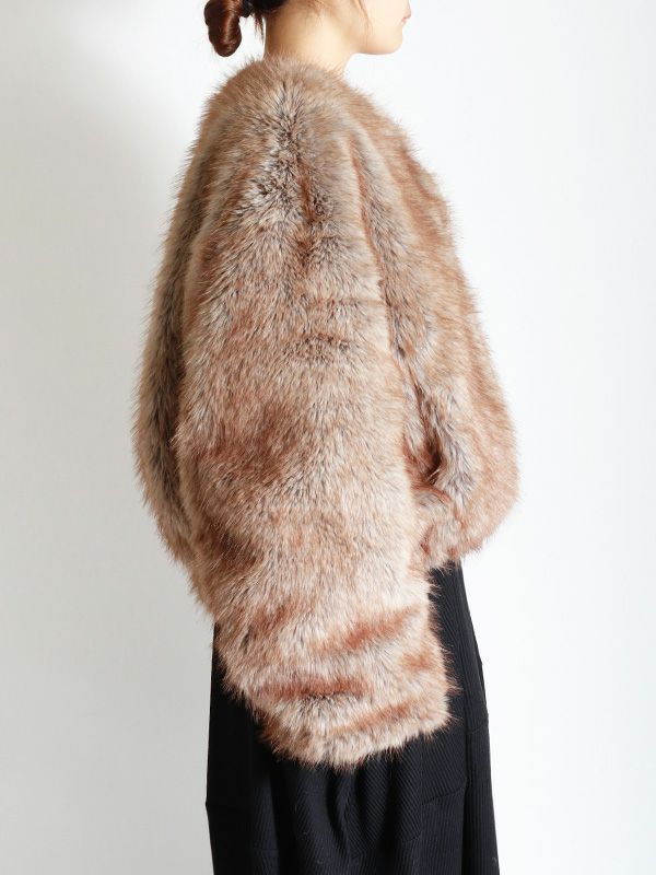 ミンクのような毛並みと、ボリュームのある柔らかな肌触りが魅力のフェイクファーとアクティブな印象のシャリ感のあるノーカラーブルゾンの2つのまったく異なる表情が楽しめるリバーシブルブルゾン。ノーカラーのスッキリとしたネックラインが着用時に抜け感のある動きを生みます。身幅と袖にたっぷりとゆとりを持たせたシルエットにややコンパクトな着丈。裾のストリングでシルエットの調整をしていただけます。