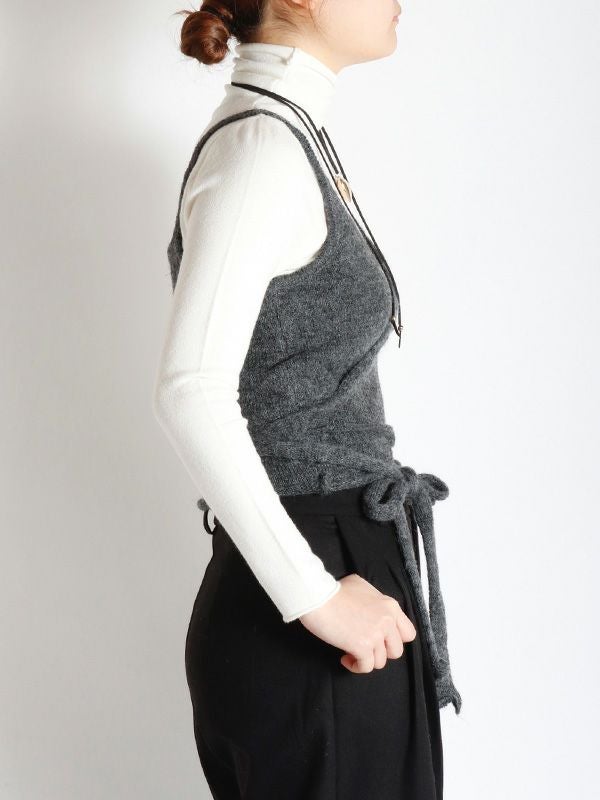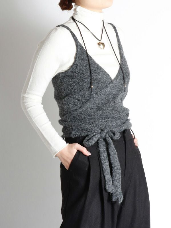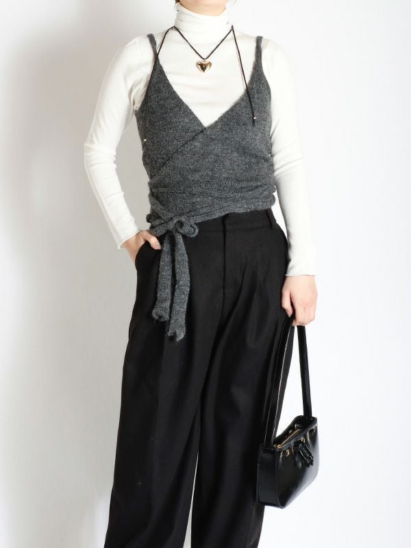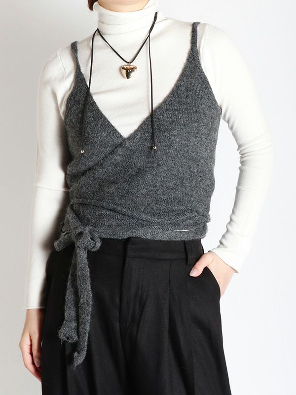 冬のレイヤードスタイルに欠かせないニットビスチェ。シャツやブラウス、カットソーまでシンプルなトップスに合わせるだけでトレンド感のあるコーディネートが決まります。フェミニンなカシュクールデザインなのでインナーに着るものによってサイズ感を自由に調整できるのも嬉しいポイント。ベーシックなブラック・チャコールの2色展開で着回しが効く、今期のレイヤードスタイルにおすすめのアイテムです。