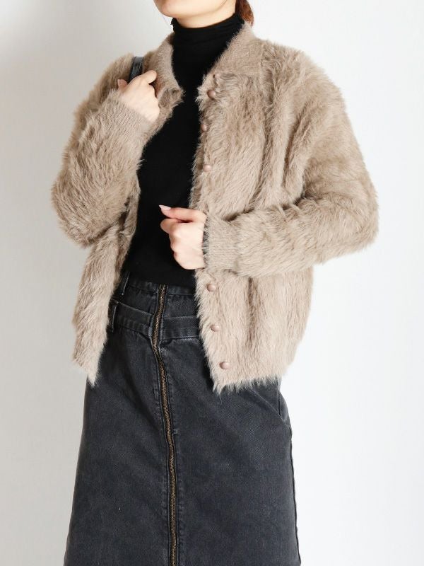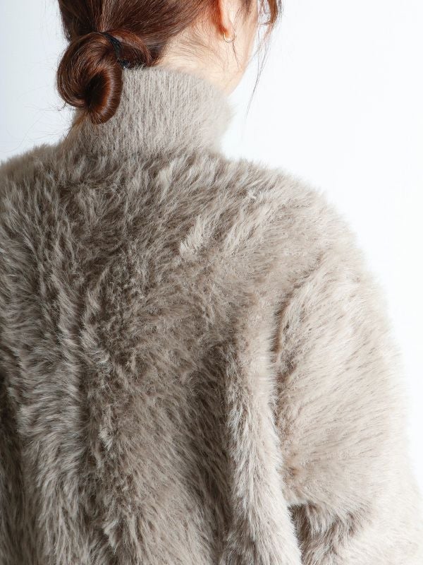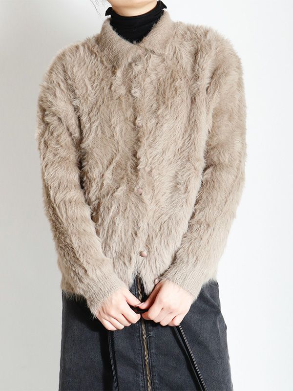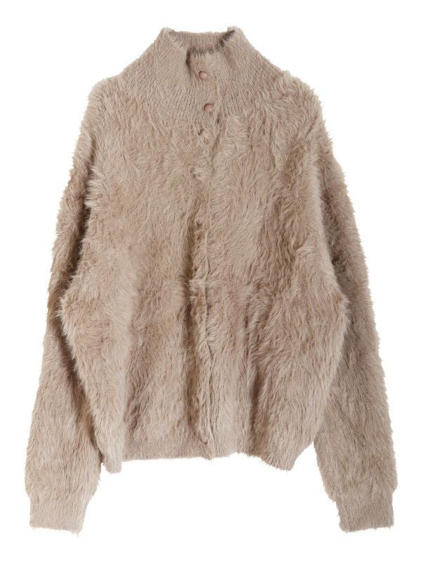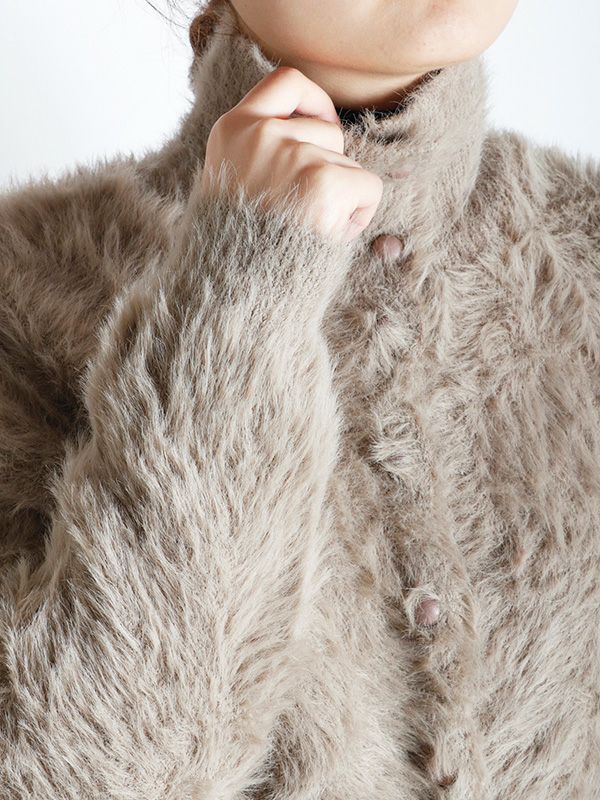 ふんわり柔らかい毛足が特徴のシャギーニットを使用した、ハイネックデザインのカーディガン。1枚で着映えし、幅広いスタイリングに馴染む着回し力万能なアイテム。カーディガンとしてはもちろんハイネックニットとしての着用もおススメです。柔らかなシャギーのニュアンスが華やかさを演出し着るだけで大人の可愛らしさとリラックス感を高めてくれます。スラックスパンツやクラシカルなプリーツスカートを合わせることで、オフィスにも対応できる大人上品なスタイリングが完成します。