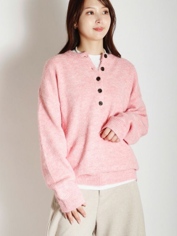 トレンド感のあるハーフボタンデザインを、柔らかなニット素材でアップデート。 ドロップショルダーと長めに設定した袖丈が女性らしいユルッとした抜け感を演出し、着るだけで洗練された印象になります。 ゆとりのある身幅でありながら、ボトムスを選ばない絶妙な丈感で、スタイルアップを実現します。飽きのこないベーシックなデザイン、長く愛用できる一着です。シンプルにデニムやスラックスと合わせても、柄スカートをプラスして華やかなコーディネートに挑戦するのもおすすめです。
