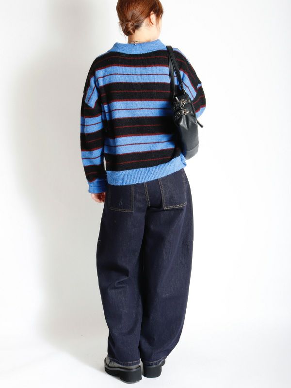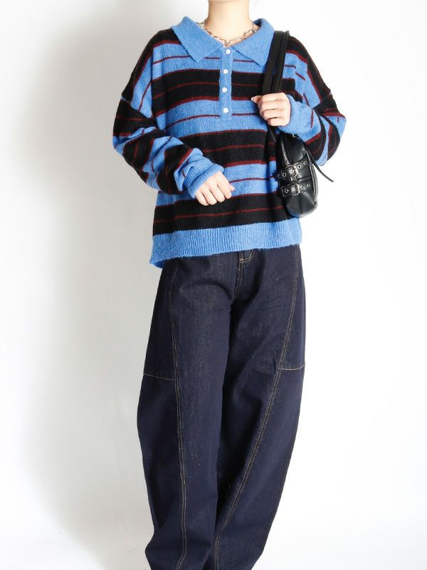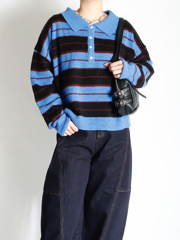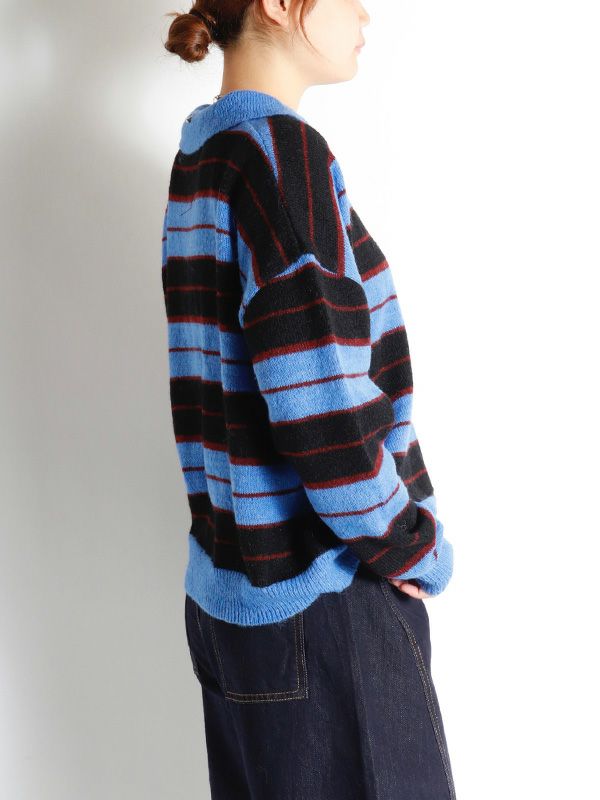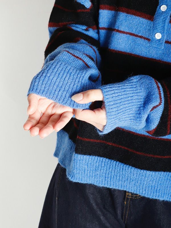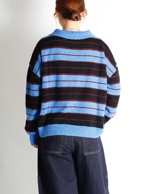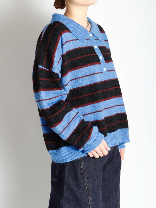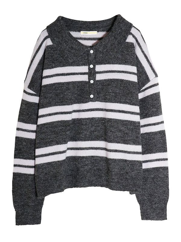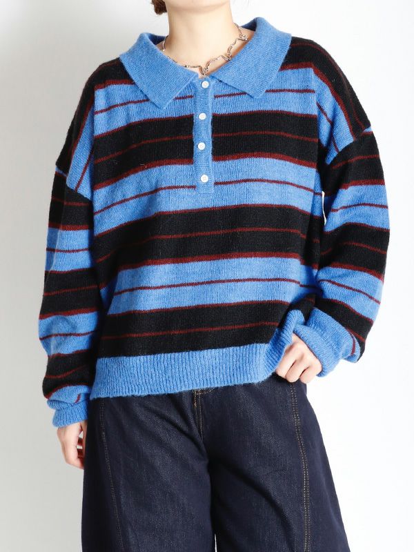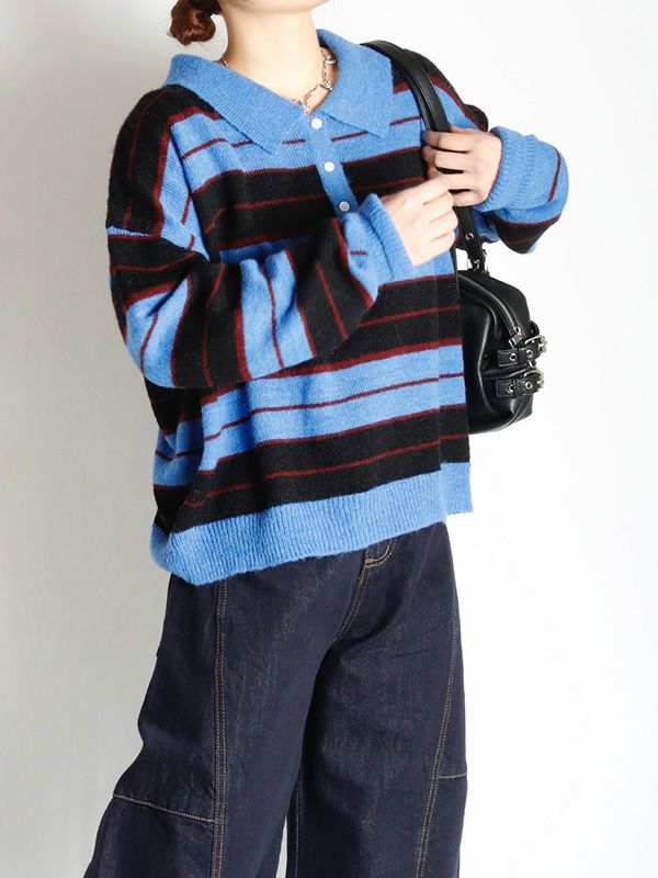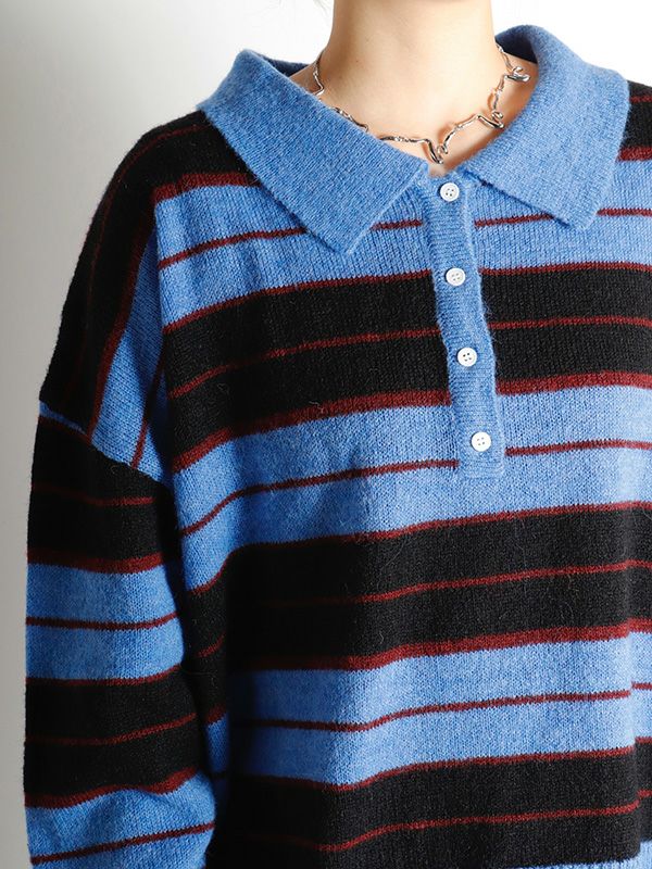 雰囲気のあるボーダー柄のポロニット。単調になりがちなボーダー柄の配色はアクセントカラーを配置。オーバーすぎないややルーズなサイズ感。薄手ながらフワフワとしたおしゃれな印象のニット地です。程良いゆとりで心地良く着用いただけます。ミニボトムやバレルパンツなど、旬のアイテムと合わせるだけでトレンド感のある大人カジュアルスタイルが完成。着回し力が高く、主役トップスとして活躍します。