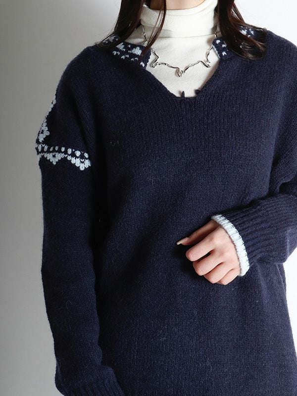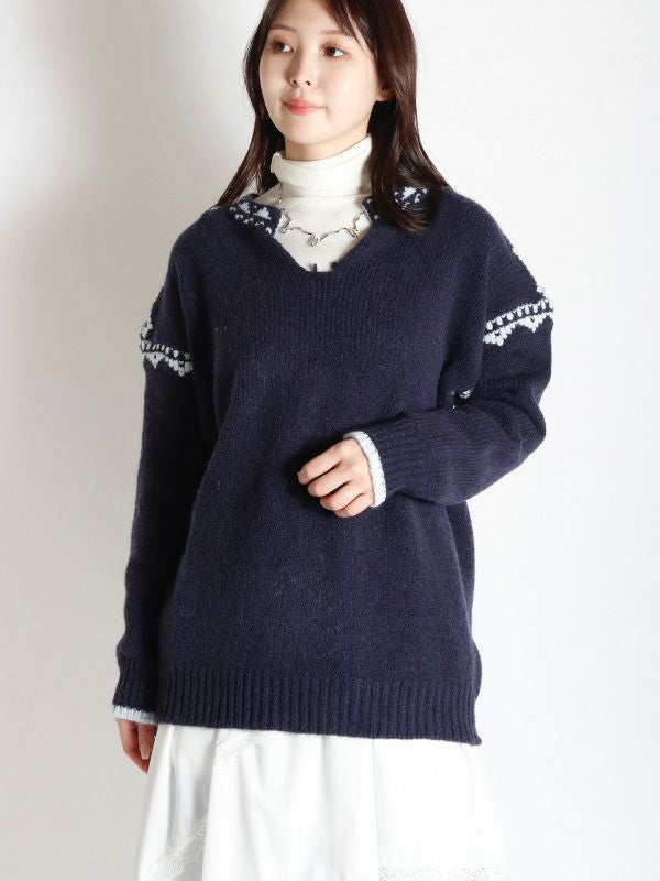 ノルディック調のジャガード模様が目を惹くニットプルオーバー。幅広いスタイルに合わせやすいシンプルデザインながら、縫い目を彩るジャガードがキャッチーでポップな印象に◎。スッキリとしたスキッパーネックが特徴。詰まりのないゆったりとした首回りで全体的にリラックス感のある着心地を叶えます。パンツと合わせた軽快なカジュアルスタイルはもちろん、フレアスカートと組み合わせたフェミニンなスタイルもおすすめです。