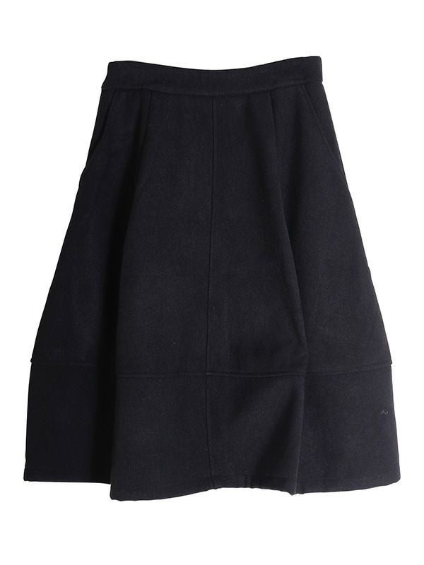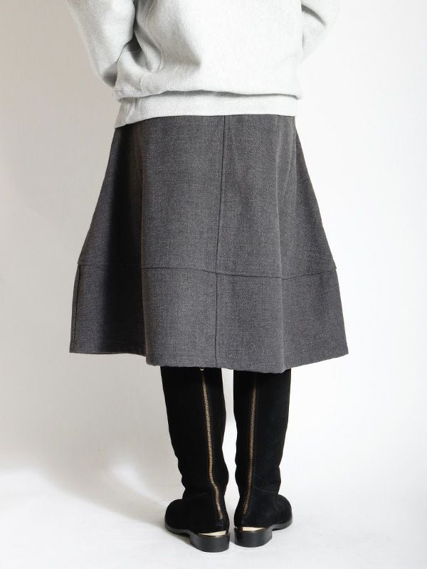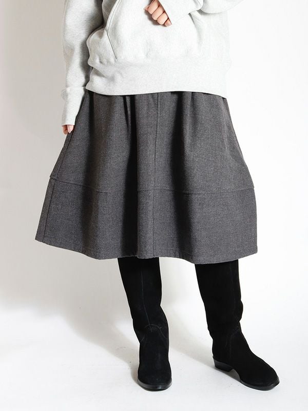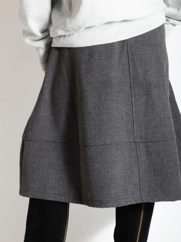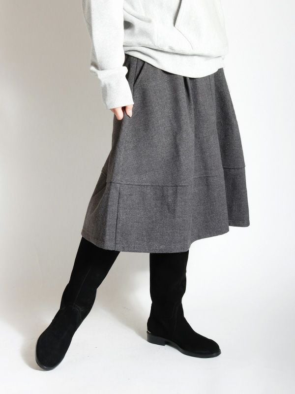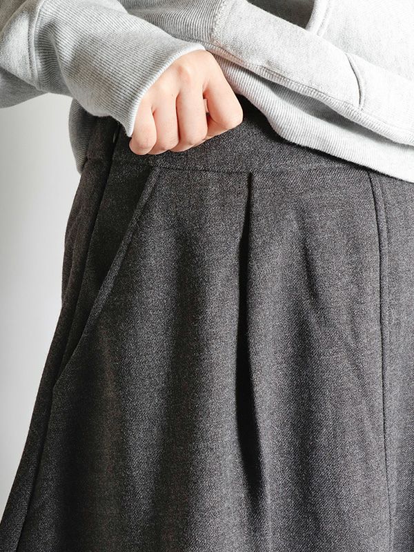 深めのタックと裾に切り替えを施したコクーンシルエットが、立体的で優雅なフォルムを描くスカート。一見シンプルですが特徴的なシルエットのスカートなのでシンプルなトップスとも好相性。後ろウエストゴムでリラックスした履き心地です。ボリュームのあるシルエットですがウエスト部分はすっきりと見える設定。トップスをインしてもアウトでもバランス良く決まります。足元にブーツを合わせれば、モード感と上品さを兼ね備えた大人のスタイルが完成します。