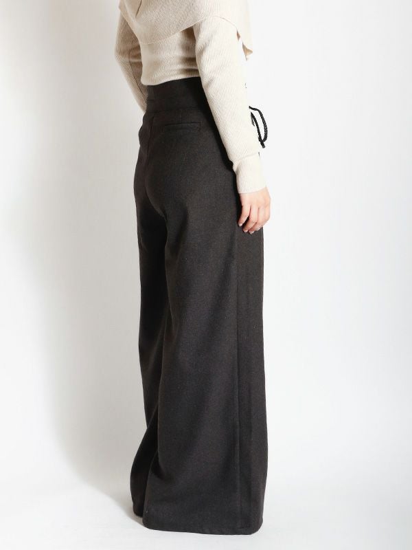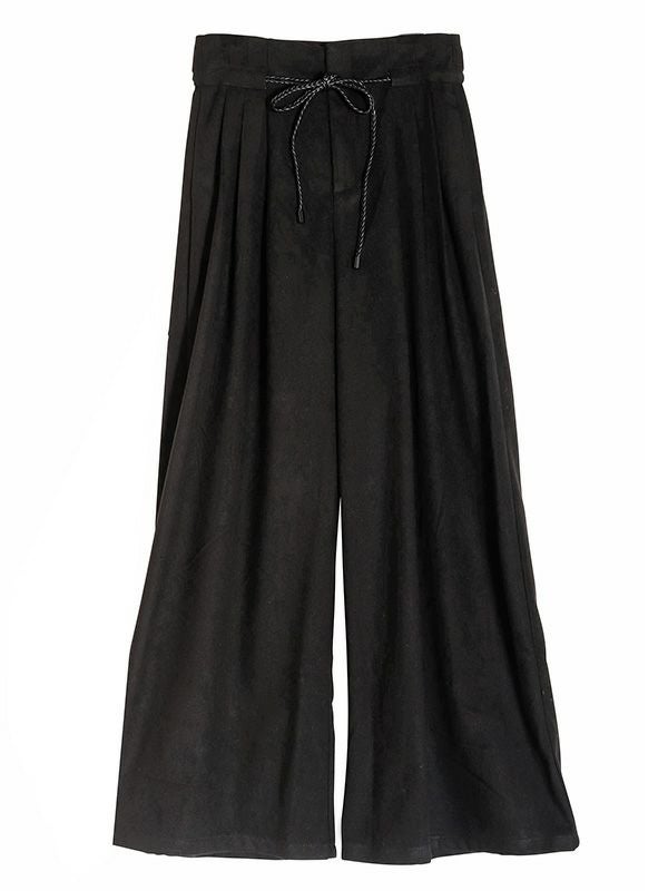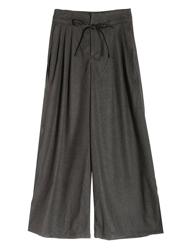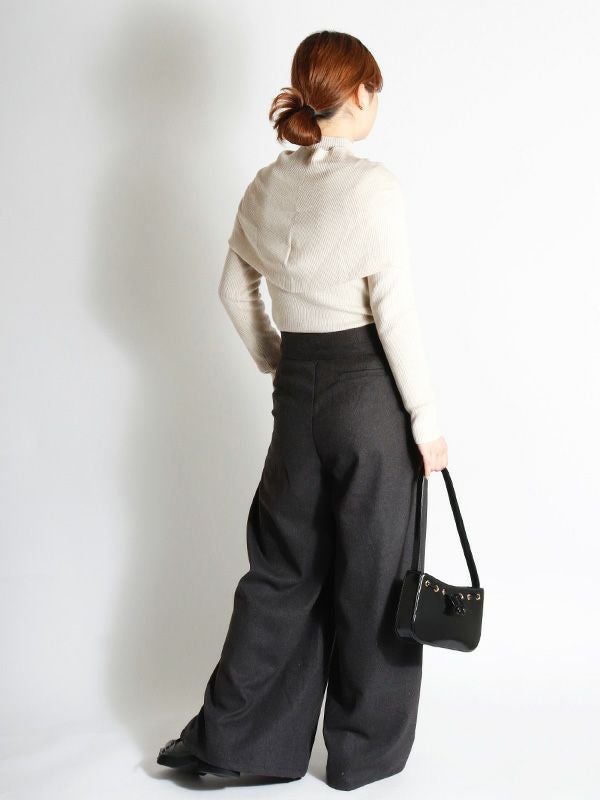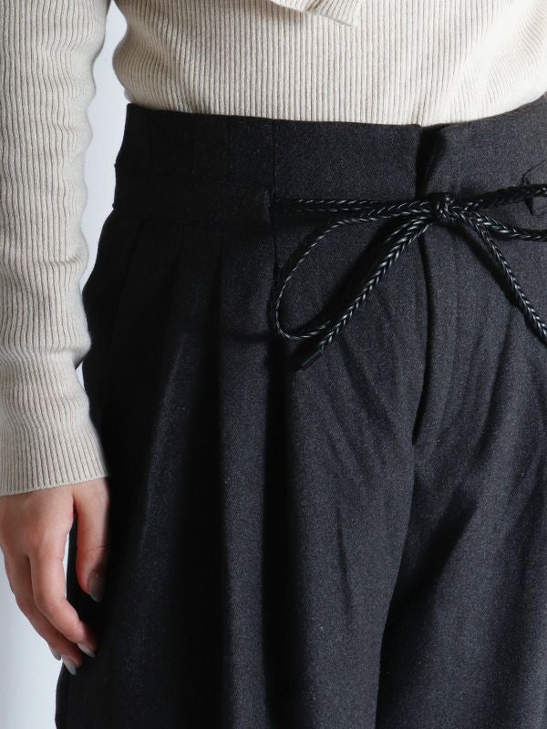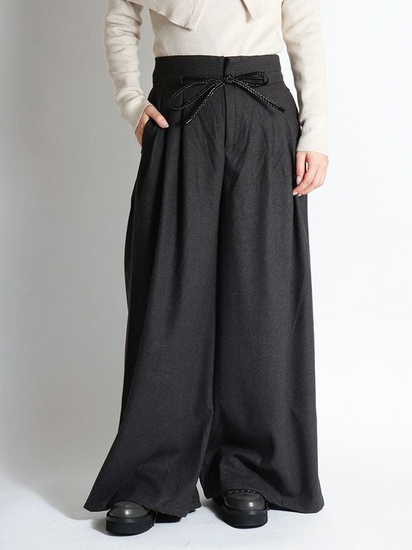 上品な雰囲気を漂わせるワイドパンツ。サイドにトリプルタックを入れ、立体的な腰回りを構成し、裾に向けて広がるワイドシルエットです。対してウエストはフィットさせ、特徴的なストリングデザインをアクセントにすることでウエスト調整が可能になりメリハリあるラインを演出できます。ブラウスやニットと合わせれば、デザインの上品さが加わり、ワンランク上のカジュアルスタイルが完成します。足元にはスニーカーはもちろん、ヒールやブーツと合わせることで、女性らしいバランスの取れた着こなしが楽しめるワイドパンツです。