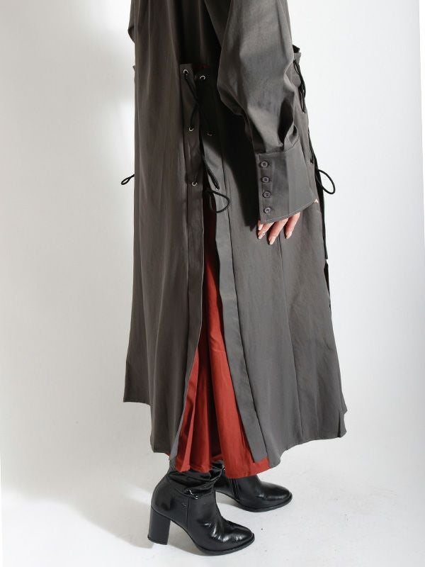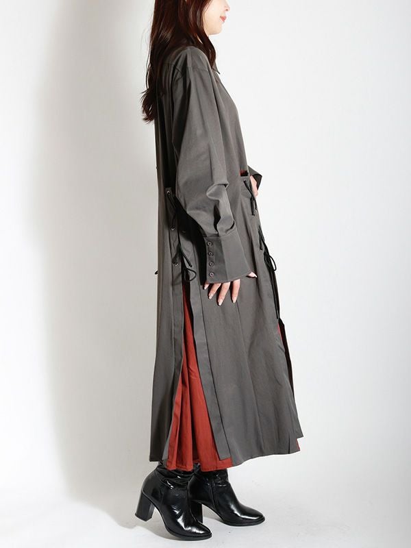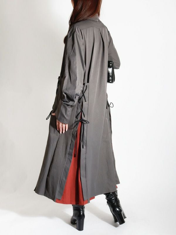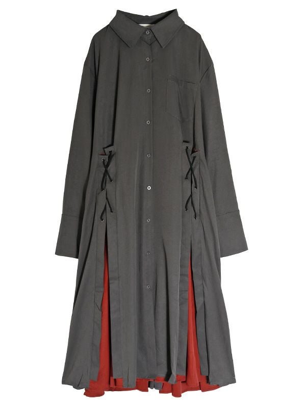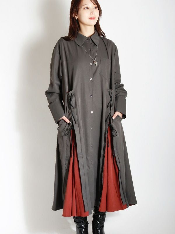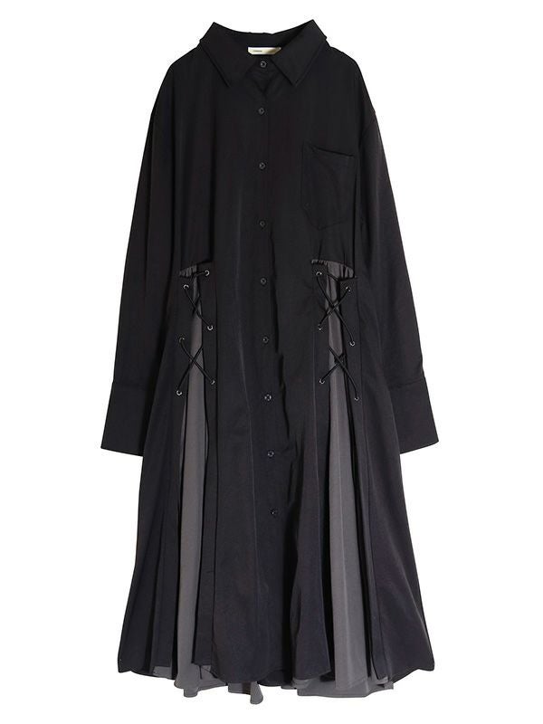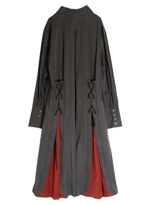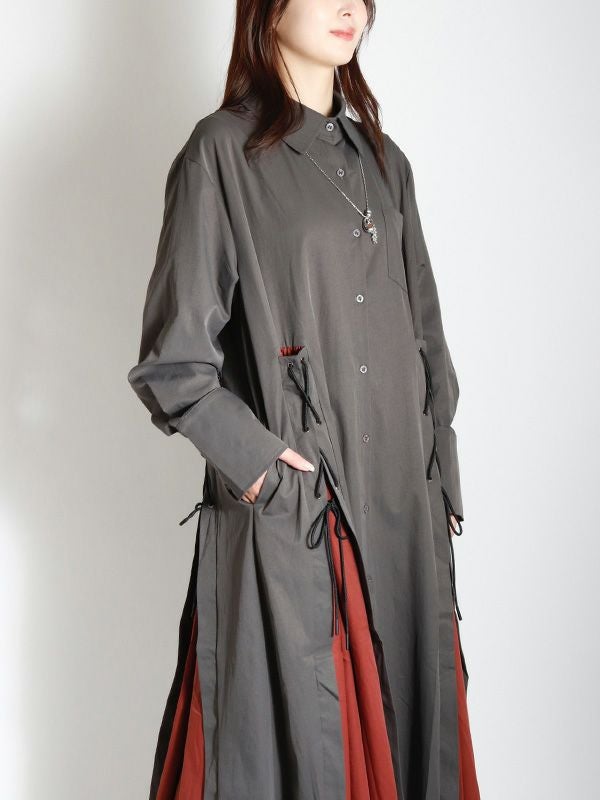 1枚でコーディネートが完成するワンピース。お好みのシューズを合わせるだけで、大人かわいく、格上げされたスタイルで着ていただけます。上品な落ち感の身頃に施したレースアップデザイン。その中から動くたびに映える配色のカラーブロックが印象的なシャツワンピースです。身体のラインを拾いすぎない、ゆとりのあるサイズ感。薄手のタートルインナーなどを合わせたり、前ボタンを開けて羽織りにするなどのレイヤードスタイルもおすすめで、ロングシーズン着て頂けます。