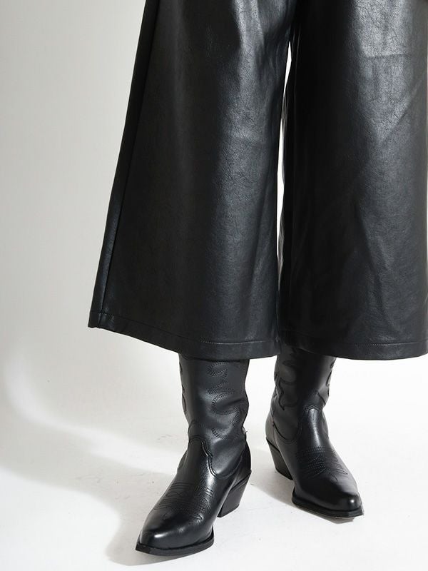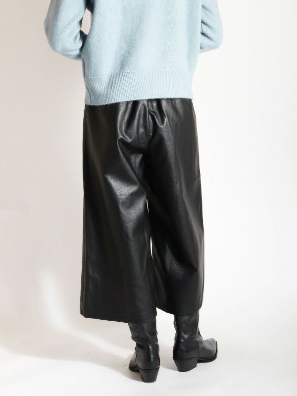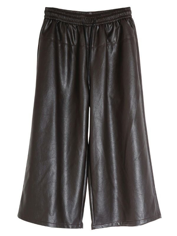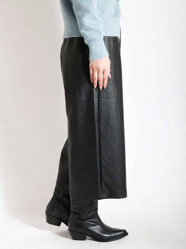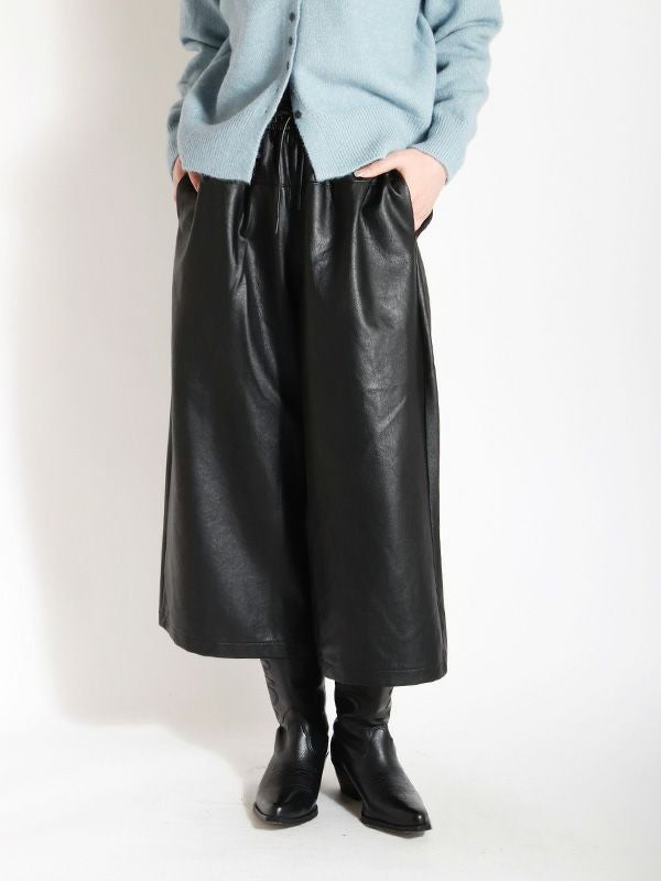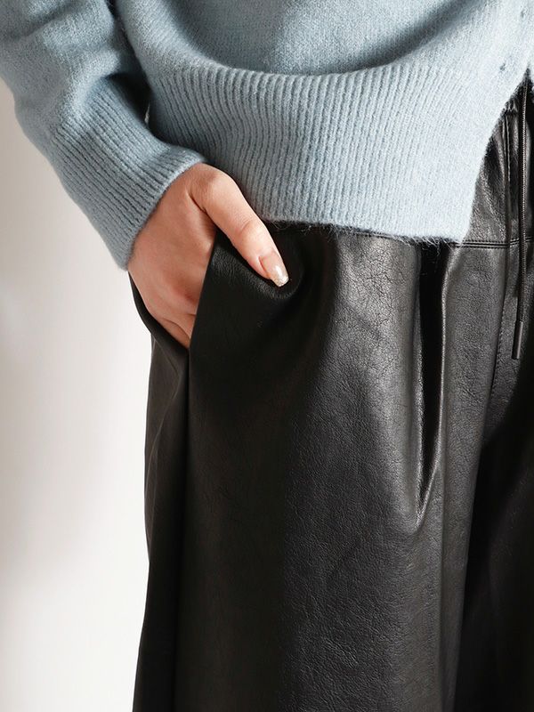 穿き心地の良さと洒落見えを重視した、柔らかいレザーライク素材で仕上げたイージーパンツ。ウエストのコードはカジュアルになりすぎないよう、レザーライク素材に合うコーティング加工を施しました。腰回りに切替デザインを入れ、間延びせずスッキリ見えするように仕上げており、ゆったりとしながらもきれい目に着用いただけます。ジャケットと合わせたモードなスタイルはもちろん、カジュアルなスウェットなどカジュアルアイテムと合わせてラフに穿くのもおすすめです。ゆったりとしながらもきれい目に着用いただけるパンツです。
