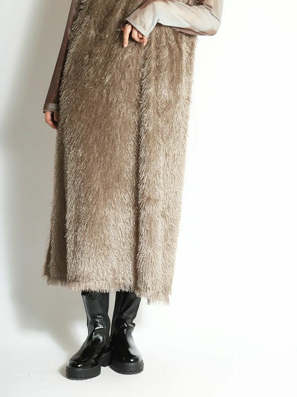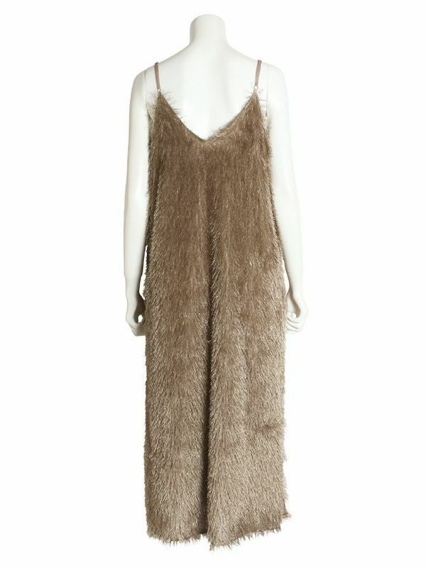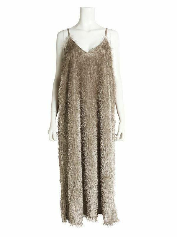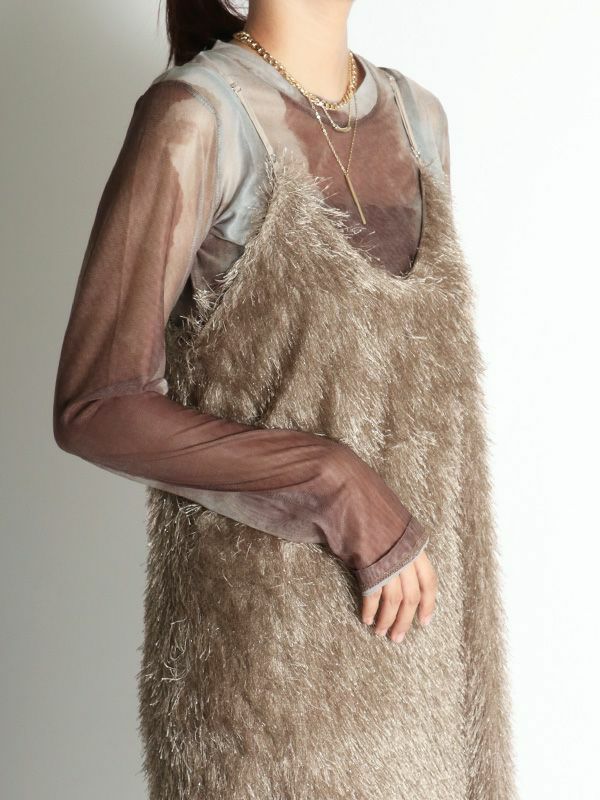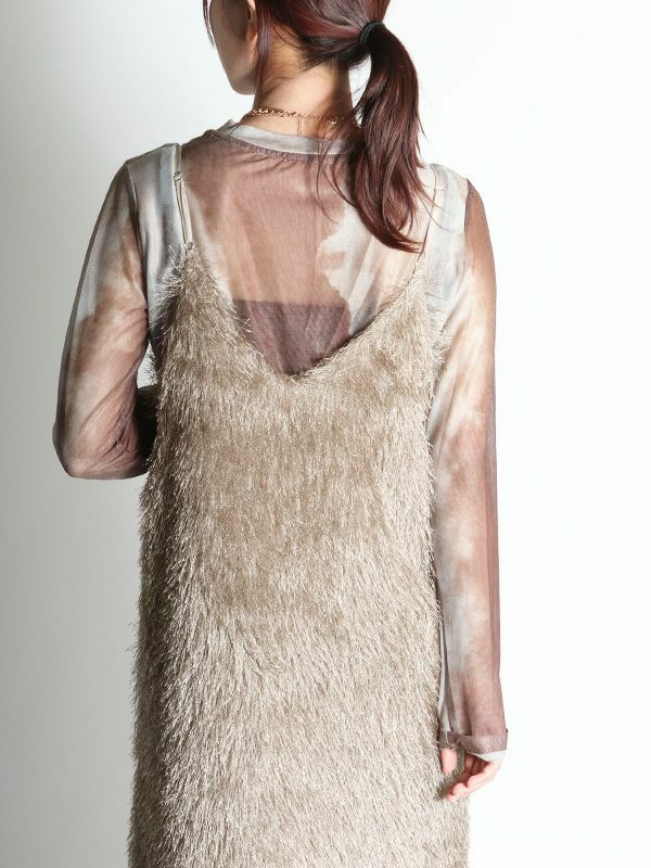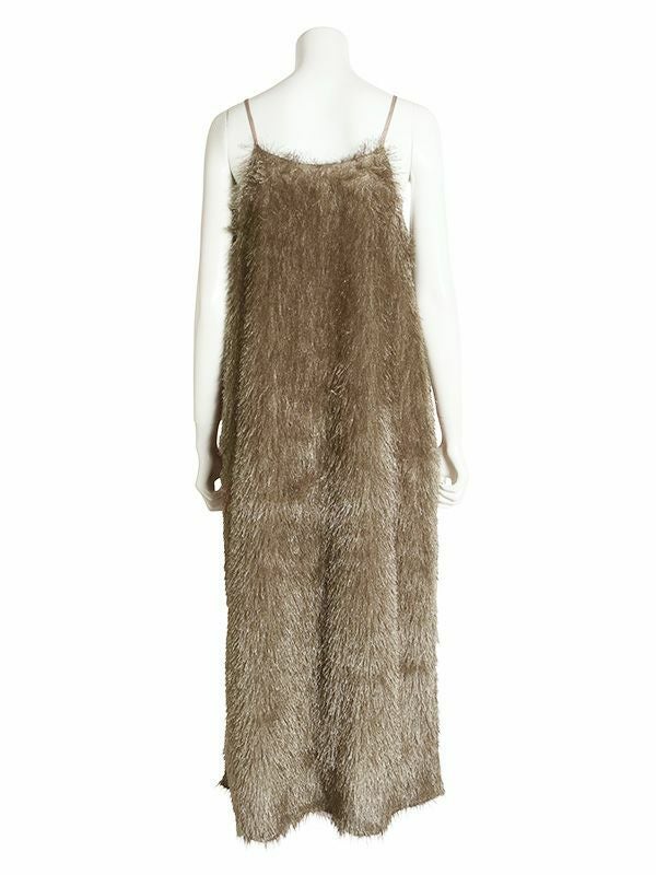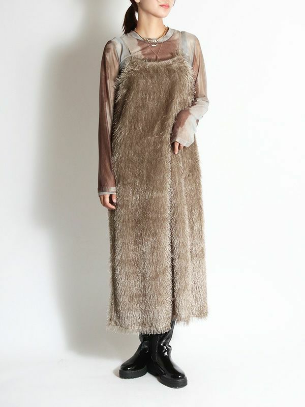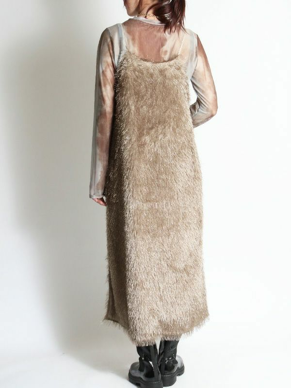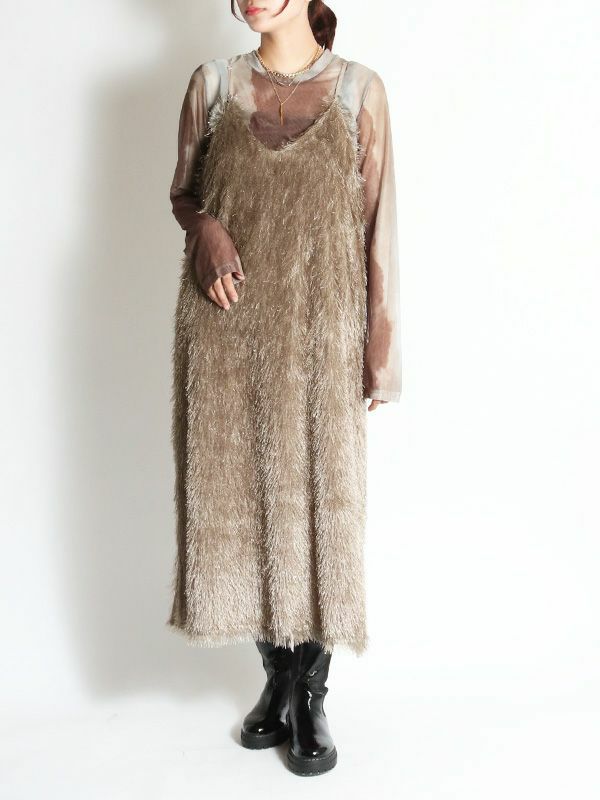 カットジャガード素材の中でも毛足の長いフリンジ生地を使用したボリューム感が魅力のキャミワンピース。ゆとりのあるシンプルな型でも動きのあるフリンジで表情豊かな印象です。前後両用で着用することが出来、雰囲気も変えられます。今からはカジュアルなTシャツ、秋からはロンTやタートルやボトムなどとレイヤードしたMIXスタイリングがおすすめ。華やかなレイヤードスタイルが楽しめるフリンジキャミワンピースです。