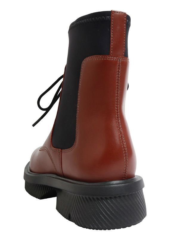 人気の異素材コンビブーツが新色を伴って今年も登場しました。伸縮性のあるストレッチ素材を組み合わせ着脱がしやすく、足首まわりは靴下をはいたようなフィット感のあるデザイン。ミニボトムとも相性が良く、ボリュームソールと足首部分のコントラストでより足元をすっきり見せてくれます。馴染みやすいブラウンカラーとベーシック纏まるブラックの2色展開。スタイリッシュにきまるデイリーカジュアルにおススメの一足です。