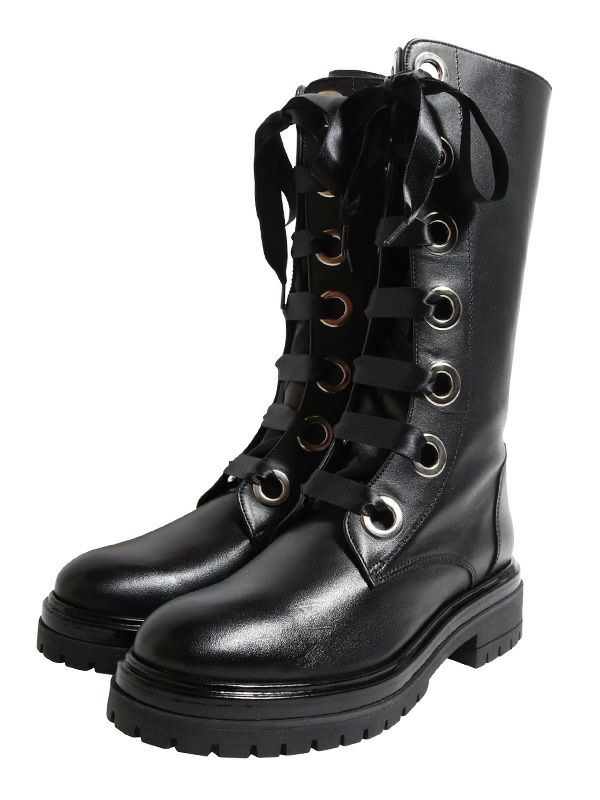 存在感抜群のリボンとハトメが施されたレースアップデザインのロングブーツ。ハードに傾きがちなブラックレザーのロングブーツを女性らしさとエッジの効いた印象に仕上げたデザイン。リボンで筒周りのサイズ感を調整できるのでシルエットの変化をボトムによって変えてお楽しみいただけます。ミニ丈のボトムスやワンピースに合わせるだけで、 スタイル全体が引き締まり、洗練された着こなしが完成。 ロングスカートと合わせて 足元に重厚感をプラスしたりと、様々なスタイリングが楽しめます。