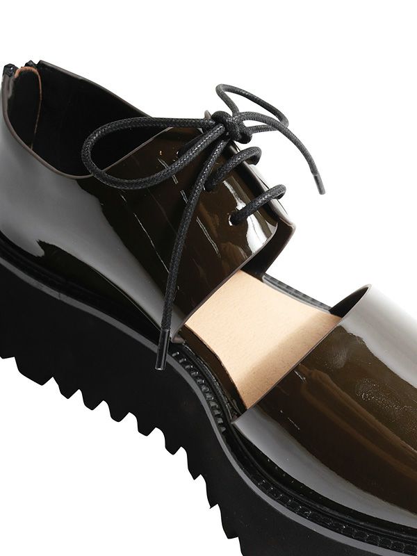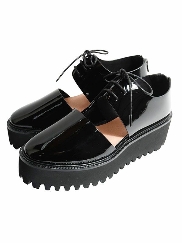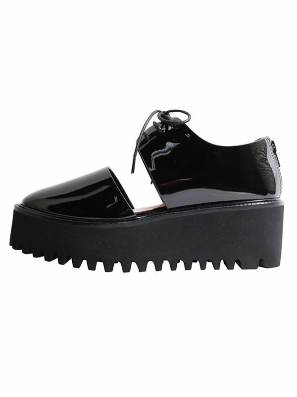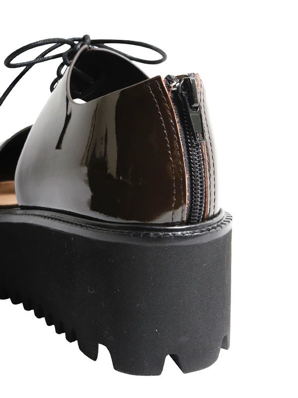 セパレートデザインのアッパーに施したレースアップディテールが印象的な表情を持つエナメルのレザーシューズ。クラシカルな雰囲気もありながら6.5cmの厚底のラバーソールが今の気分を感じさせる仕上がりです。足元に抜け感を出したいシーンや、甘さをプラスしたいモードなスタイリングにも活躍。ソックスとのレイヤードで遊びを加えるのもおすすめです。片手で穿けるバックジップデザインも魅力です。