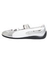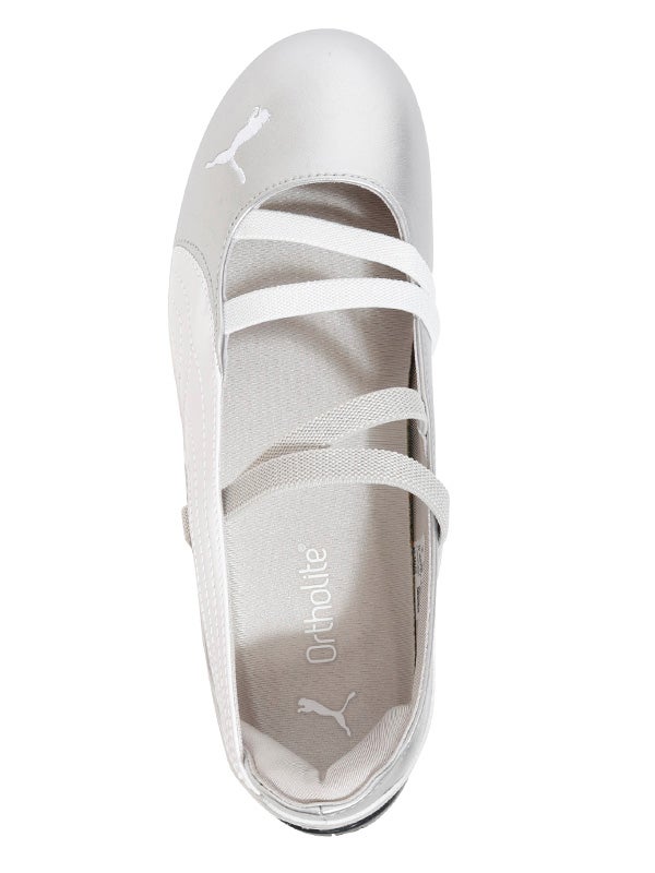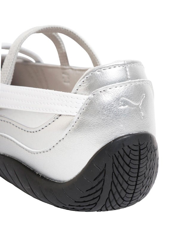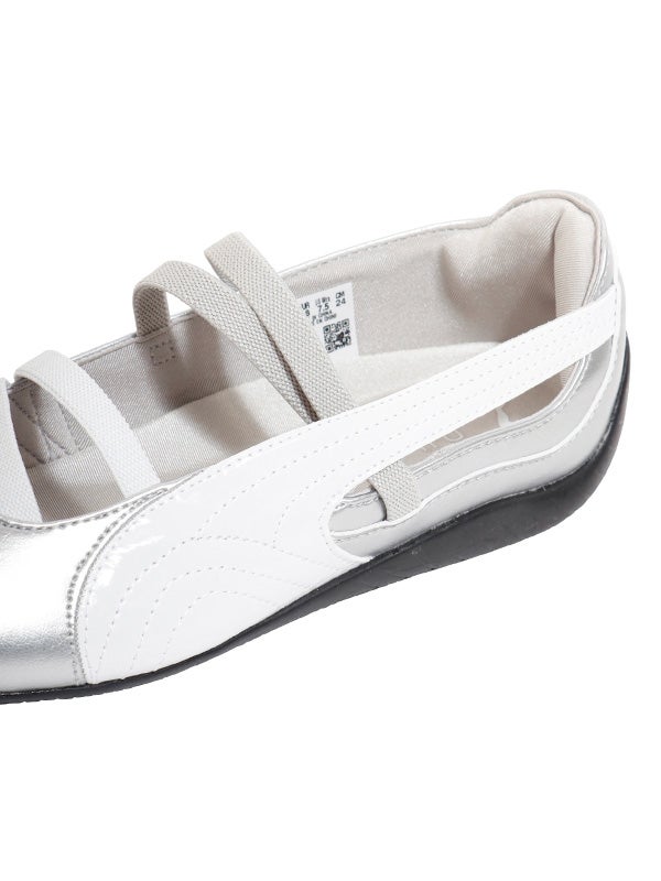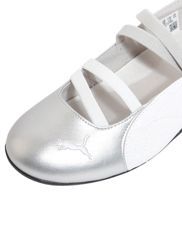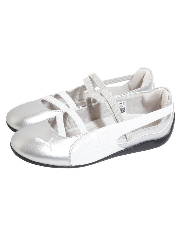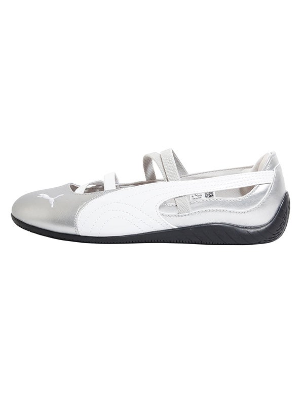 メタリックレザー素材を使用したスピードキャットのバレエシューズタイプのスニーカーが登場。ドライビングシューズにインスパイアされたスピードキャットのスリムな形状はそのままに、バレエの優雅さをプラスしたデザインです。メタリックアッパー、刺繍されたプーマキャット、モータースポーツのドライビングシューズにインスピレーションを受けたかかとを包むラバーアウトソールが特徴。フィット感を高める伸縮性のあるバンドを甲部分にプラスし、快適な履き心地を提供します。すっきりとしたシルエットでパンツスタイルにもスカートスタイルにも合わせやすいシューズです。このアイコニックなプーマのシルエットで、ロープロファイルトレンドを取り入れたコーディネートを完成させよう。