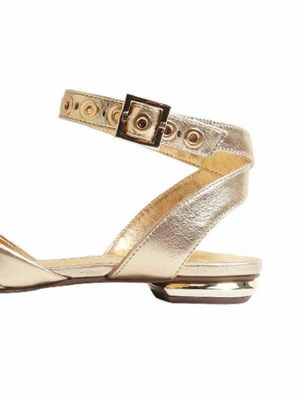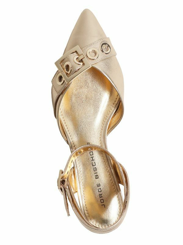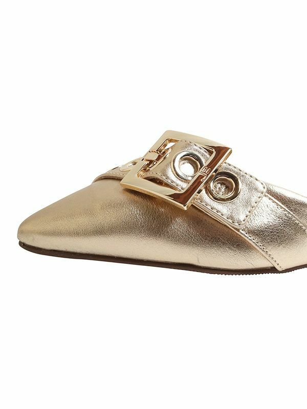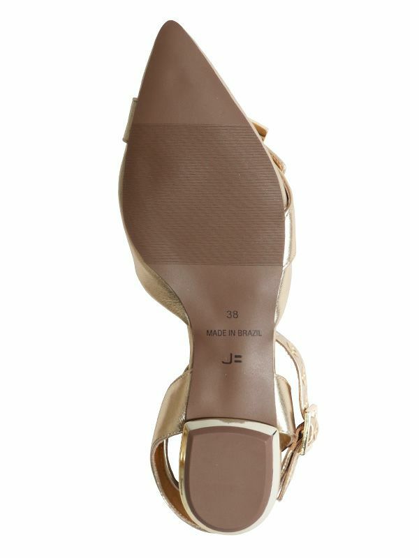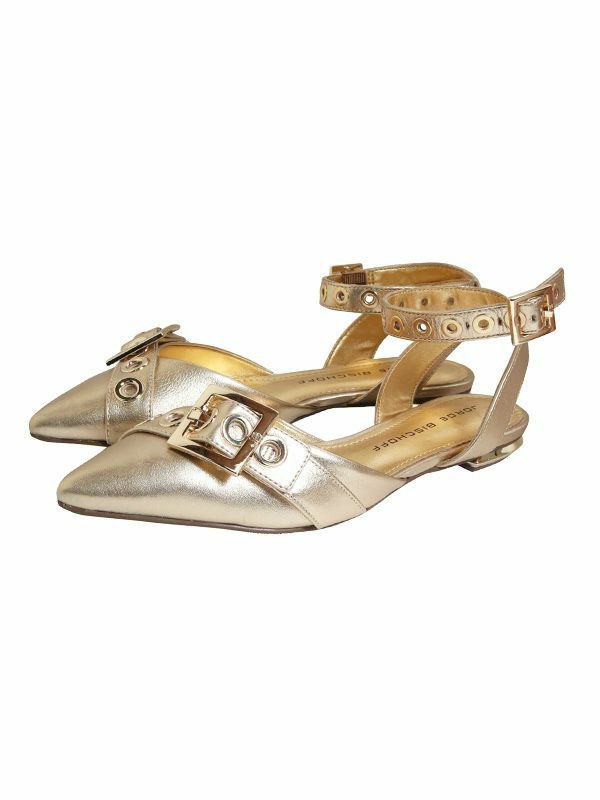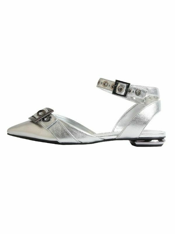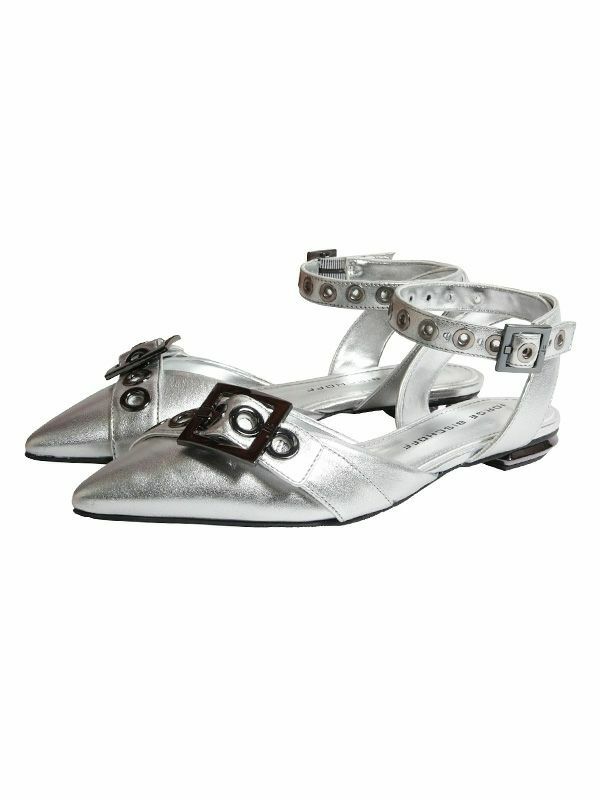甲とアンクルストラップに施した少しハードな印象の大きめのバックルxアイレットデザインがインパクト抜群なシューズ。ポインテッドトゥながらもフラットソールのため履きやすくなっています。カラーリングも印象的なシルバーとゴールドの2色展開。ワイドボトムと合わせて女性らしさを出したり、ショートボトムやスカート、ソックスとも相性が良く、コーディネートに取り入れるだけでポイントになるパンプスです。