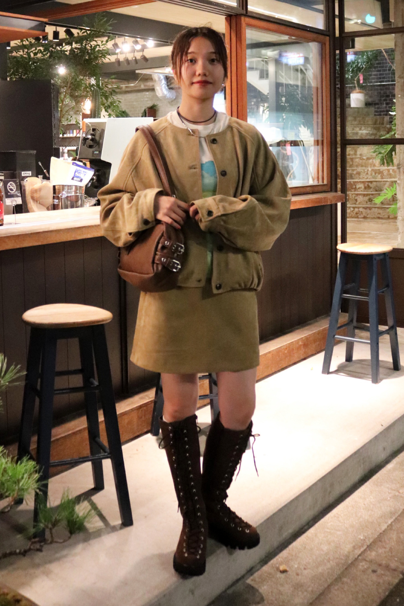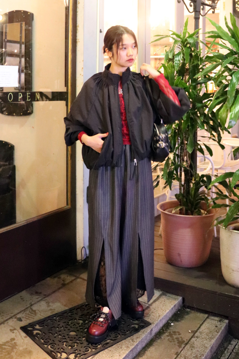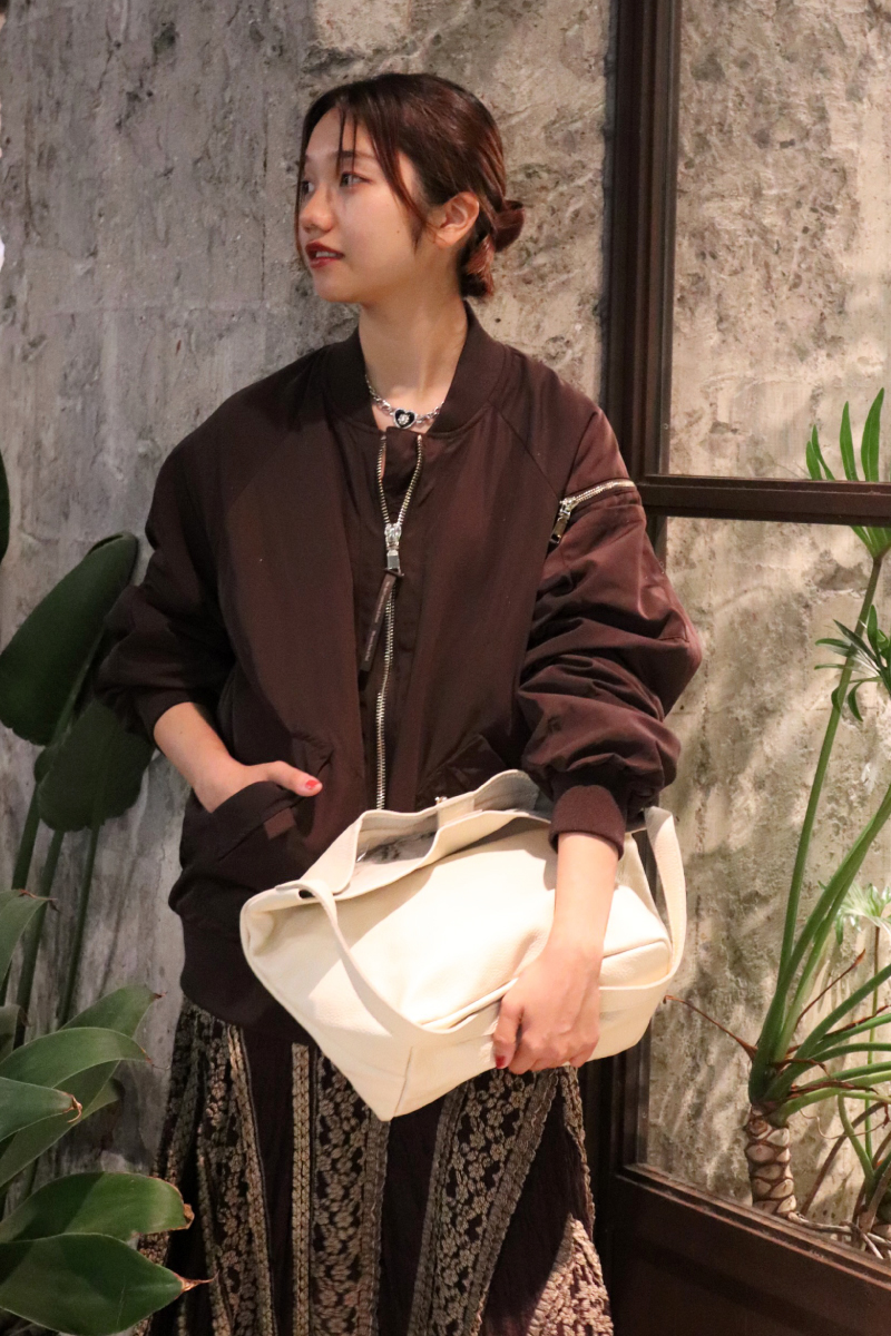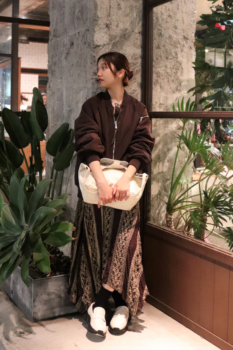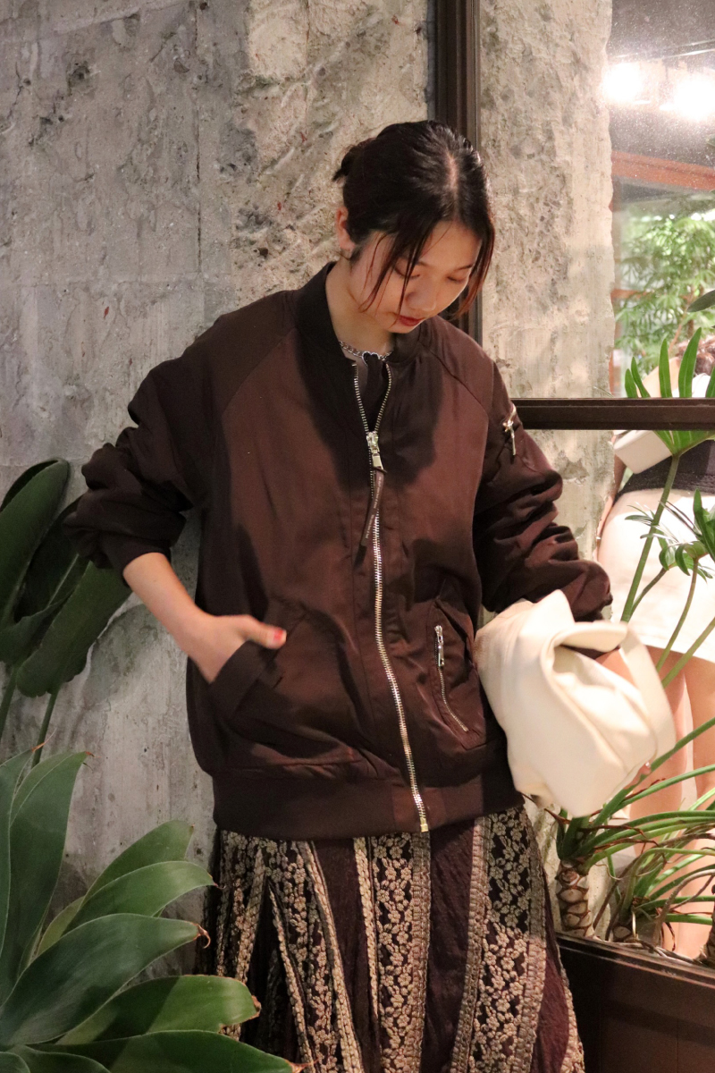 STYLING POINT定番のALLブラックをブラウンに変えて鮮度高く。タフなMA-1とフェミニンなレーシーなスカートの真逆の質感が返って新鮮味をもたらしてくれます。