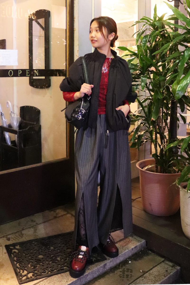 STYLING POINTハンサムムードなスタイリングにセンシュアルなレースの飾り気を足して大人でも試せる適度な色香に寄せたコーディネート。