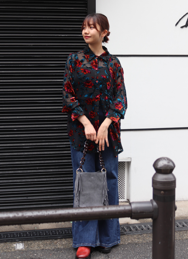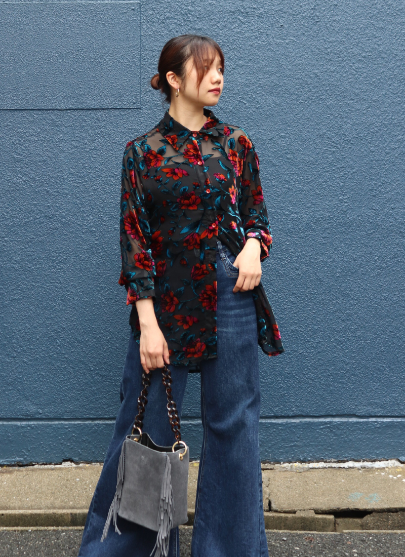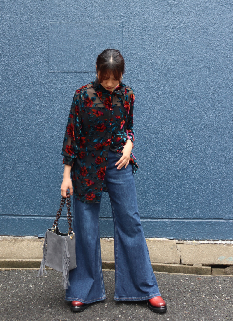 STYLING POINT懐かしさと女性らしさを演出できるシアーシャツ。1枚で大人っぽさを表現できるからデニムで崩しても程よい塩梅に纏まって◎足元は差し色を効かせて今らしく。