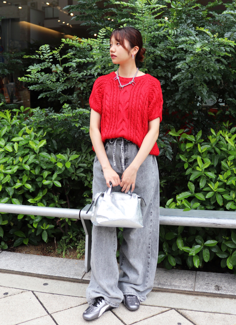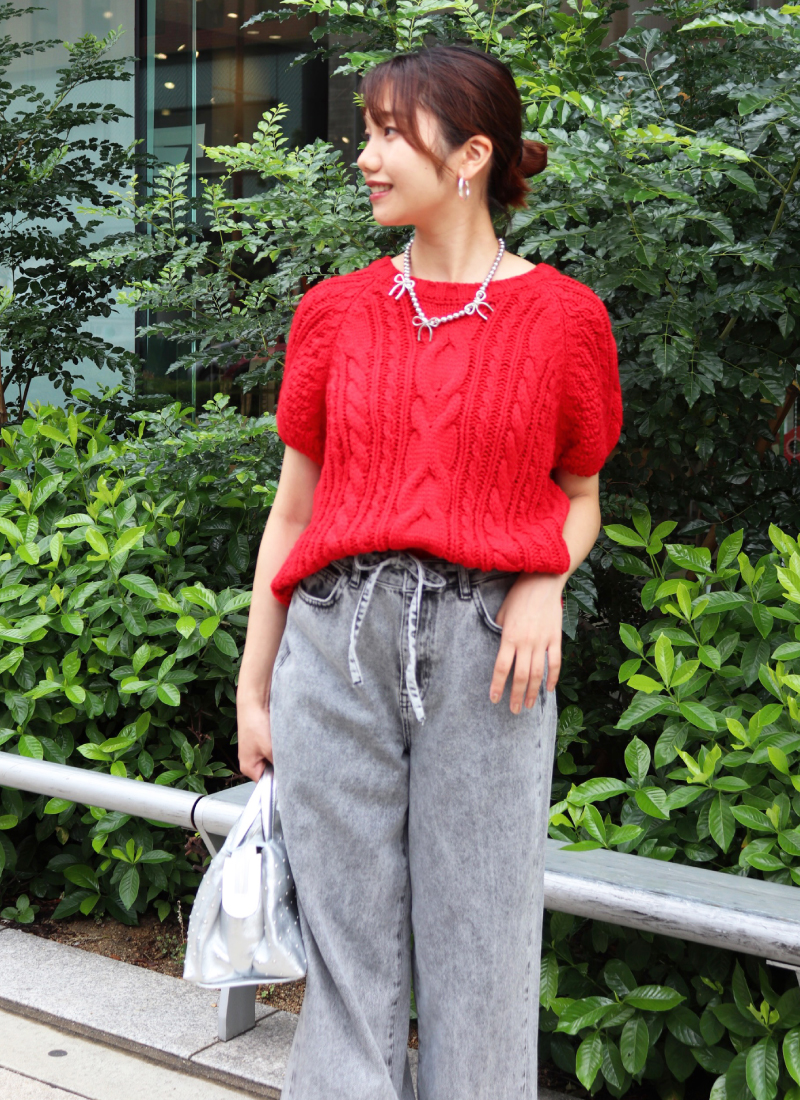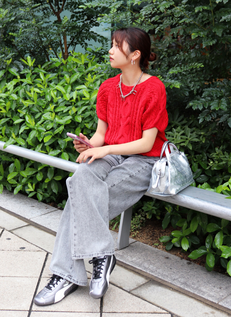 STYLING POINT王道の「赤xデニム」に変化を足して今季はウォッシュの効いたブラックデニムを投入。ニットとデニムの質感で赤と黒のコントラストが軽減され目新しい印象に導いてくれる。