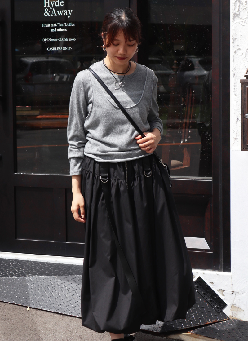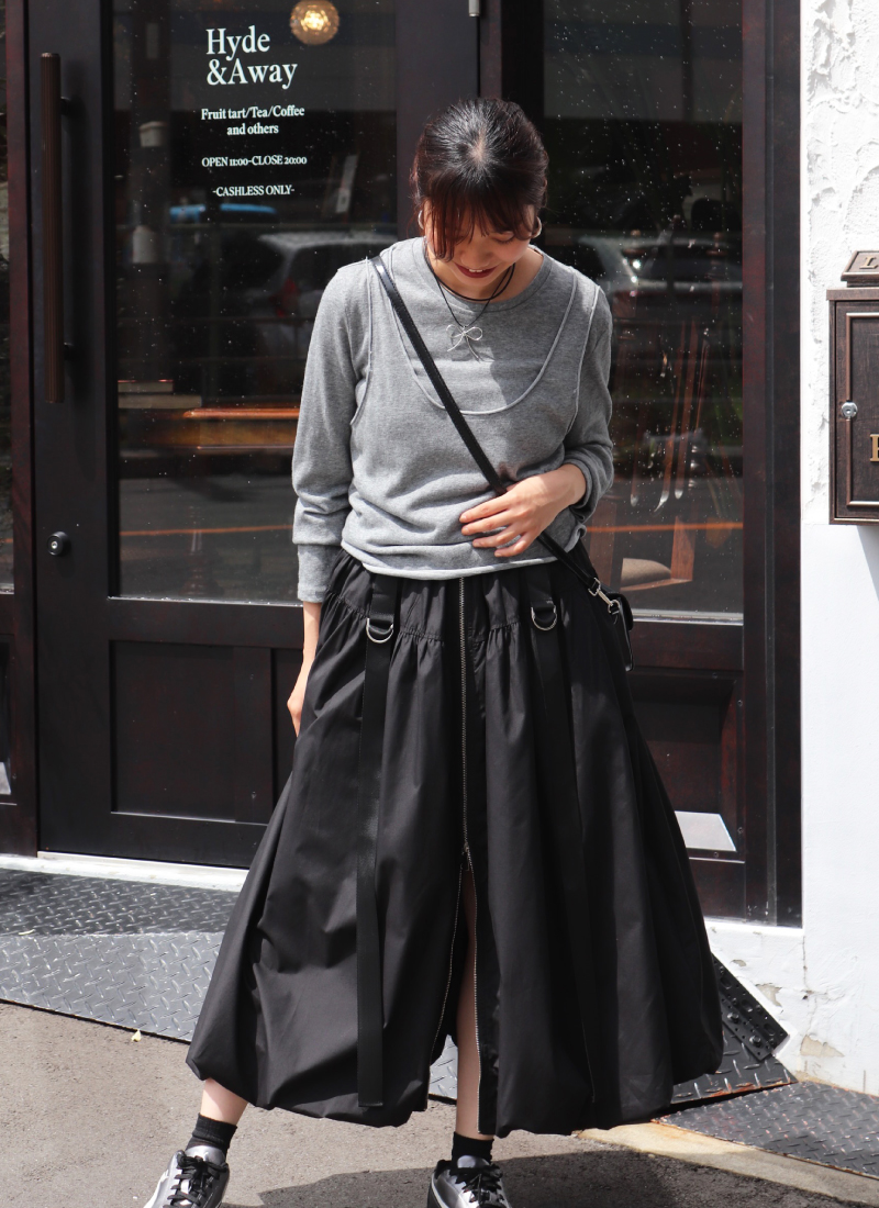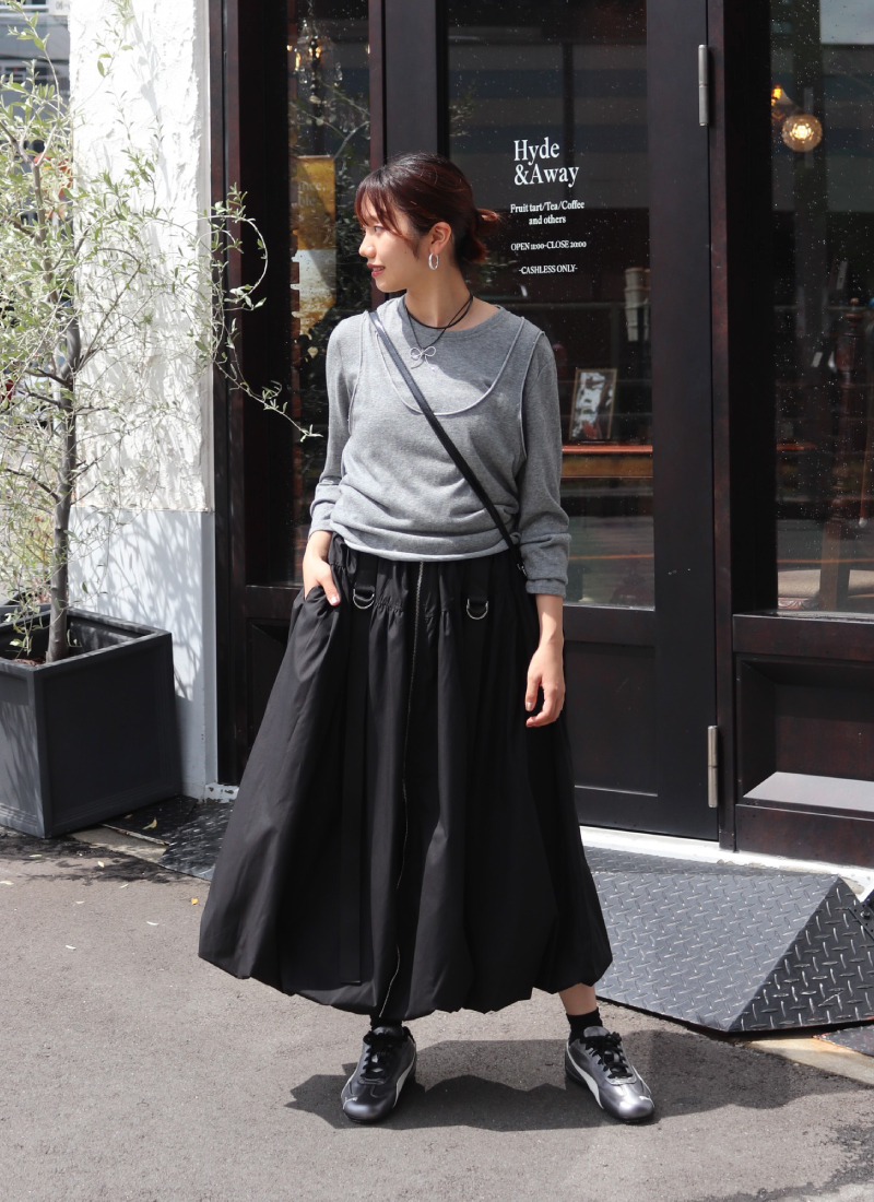 STYLING POINT硬派なデザインに愛嬌をもたらす立体的な丸いフォルム。ボリューミィなスカートにはフィット感のあるトップスが好相性。トレンドのレイヤードデザインなら更に旬顔に。