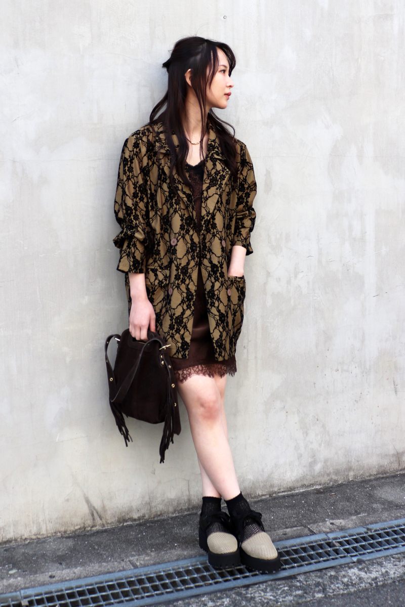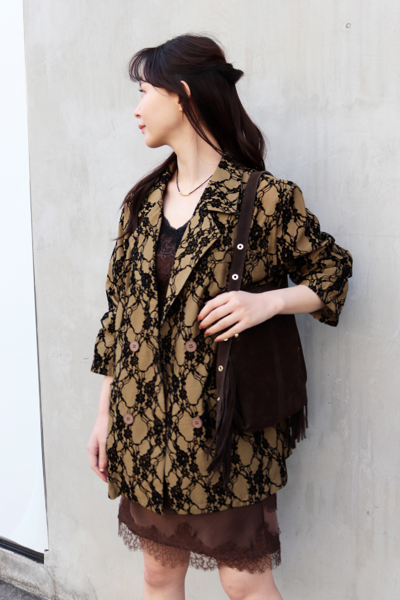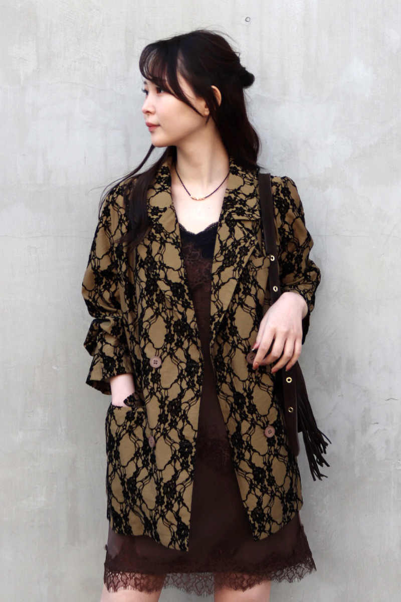 STYLING POINTレーシーな柄のテーラードジャケット。ダブルブレストのハンサムデザインなら、センシュアルなランジェリーライクなセットを合わせてもクールに纏える。