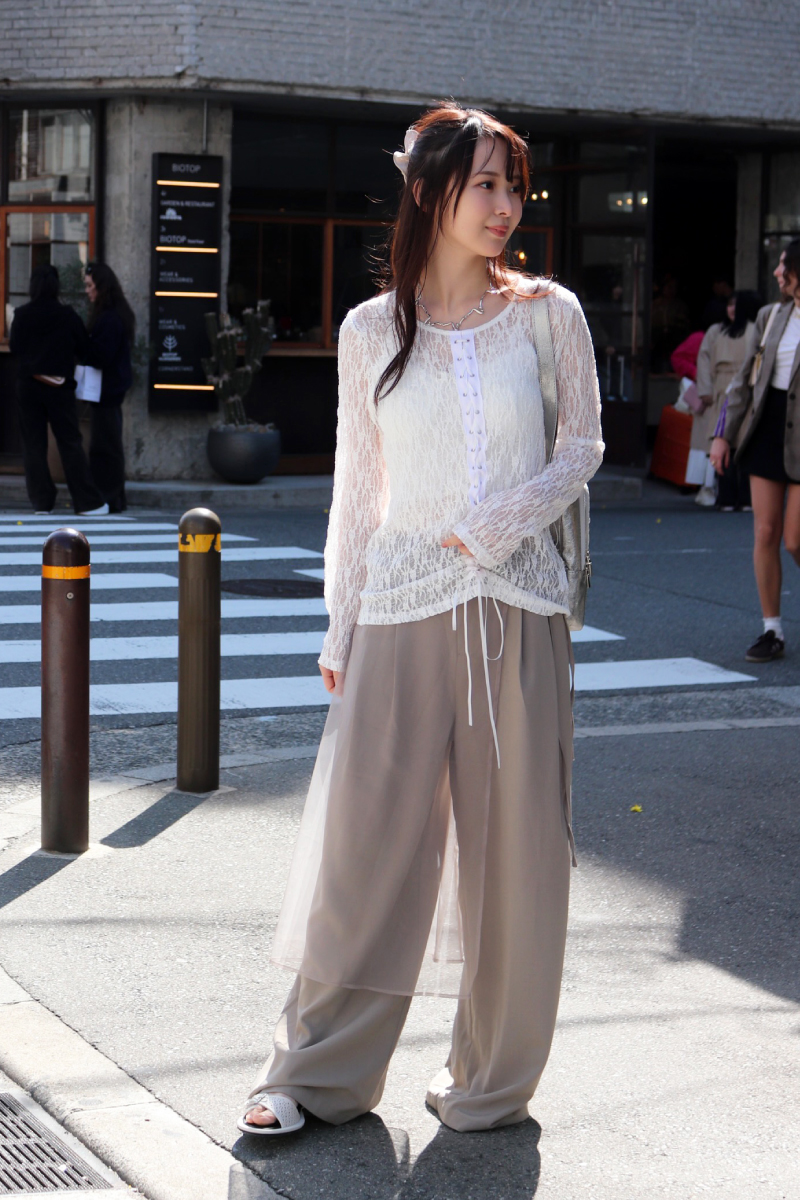 STYLING POINTレースやシャーリングなど繊細でクラフト感のあるパンツを、定番のスウェットと合わせる。「カジュアル以上」の旬顔コーデに更新。