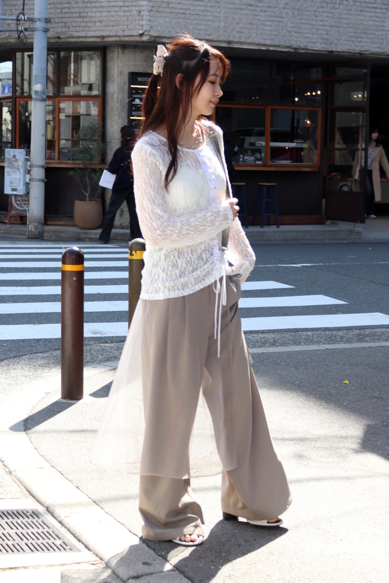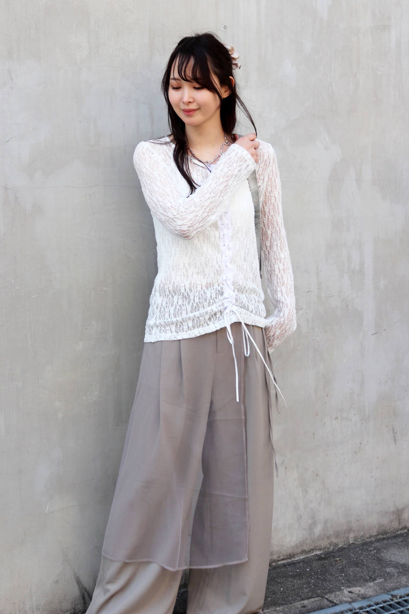 STYLING POINTチュール素材を重ねたハンサムなスラックス。繊細なレーストップスを合わせてもガーリー手前に落ち着き、コーディネートが華やぎます。