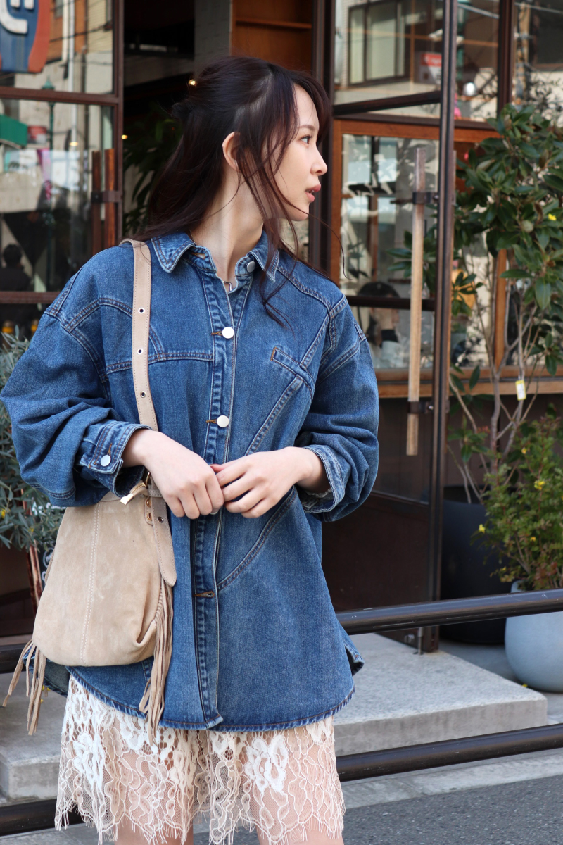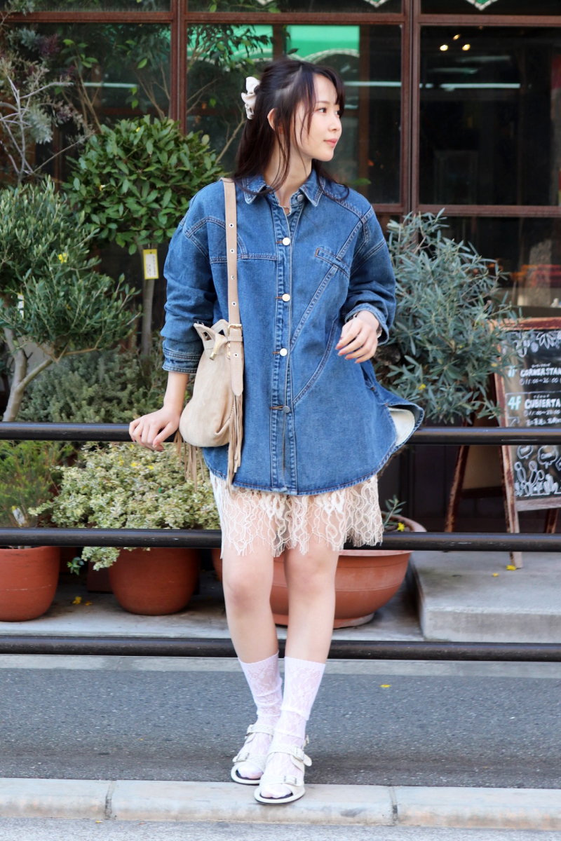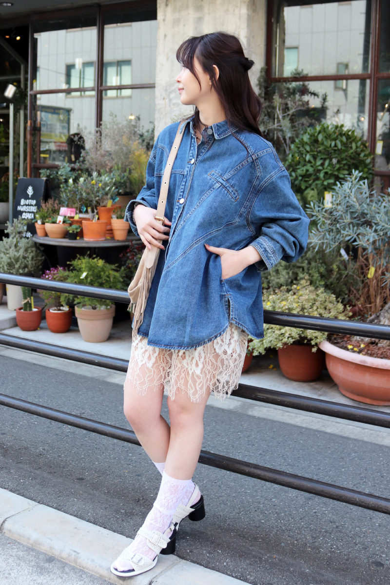 STYLING POINT今またジワジワと盛り上がりを見せるデニムシャツ。カジュアル度が高いアイテムこそトレンド感のあるレーシーなミニをあわせると、意外にもシックリ。