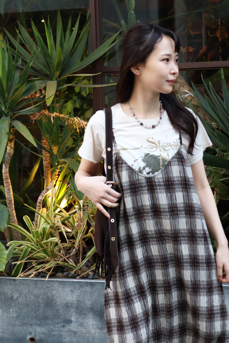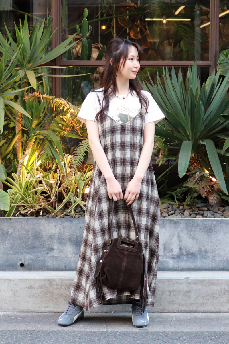 STYLING POINT定番のキャミワンピをトレンドのチェック柄にアップデート。スタイルアップにつながるIラインは意識して「大人カジュアル」はしっかりキープ。