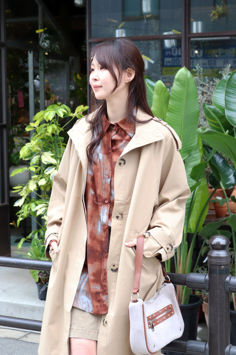 STYLING POINTキチンと感のあるトレンチ調のコートを同系色で馴染ませながらラフに着こなす。中のデザインは極力シンプルにすると色柄がアクセントとして引き立つ。