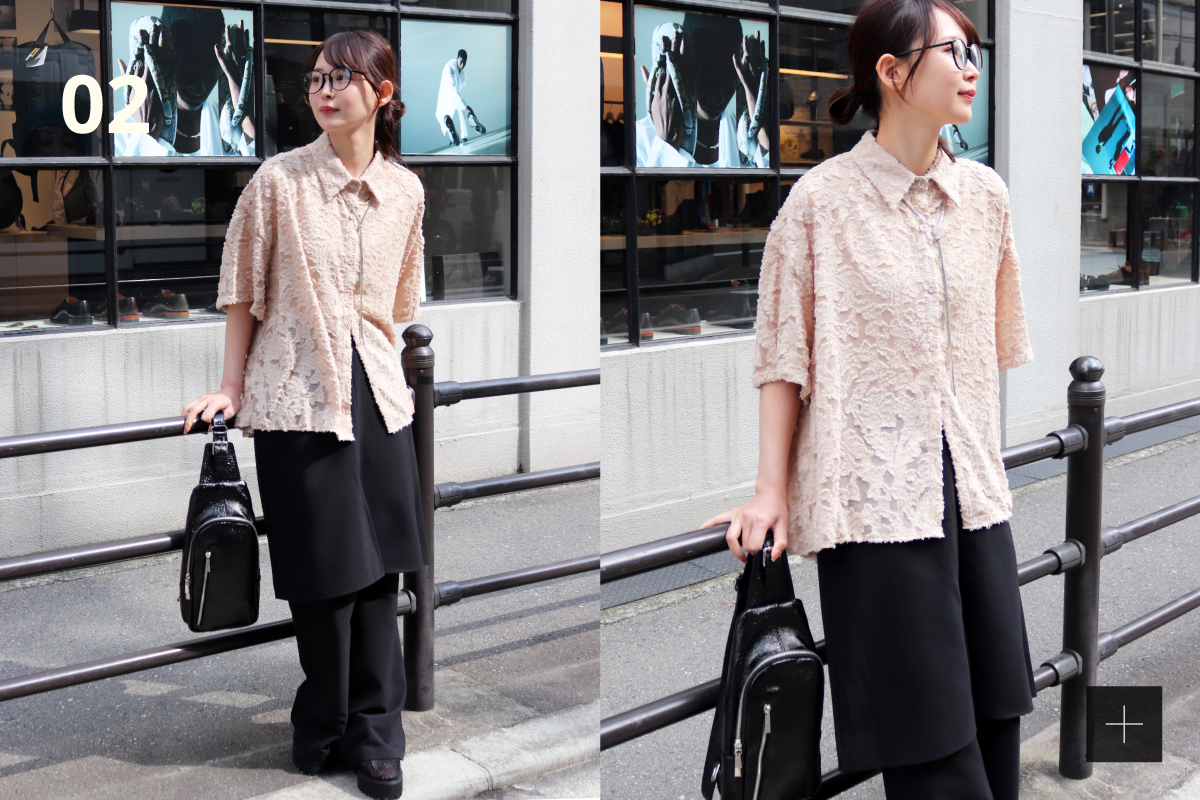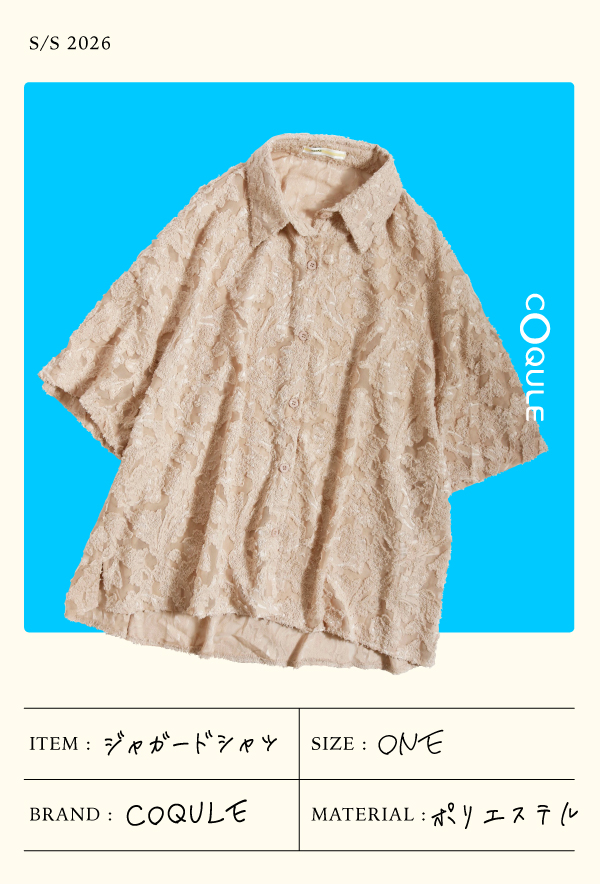 「シワになりにくい起毛ジャガード生地」シャツという真面目さを持ちつつ、シアー感がありながらも透けすぎない風通しの良いヘアリージャガードはシンプルながら着映えるアイテム。ゆとりのあるシルエットですが体に沿う落ち感で女性らしく着ていただけます。