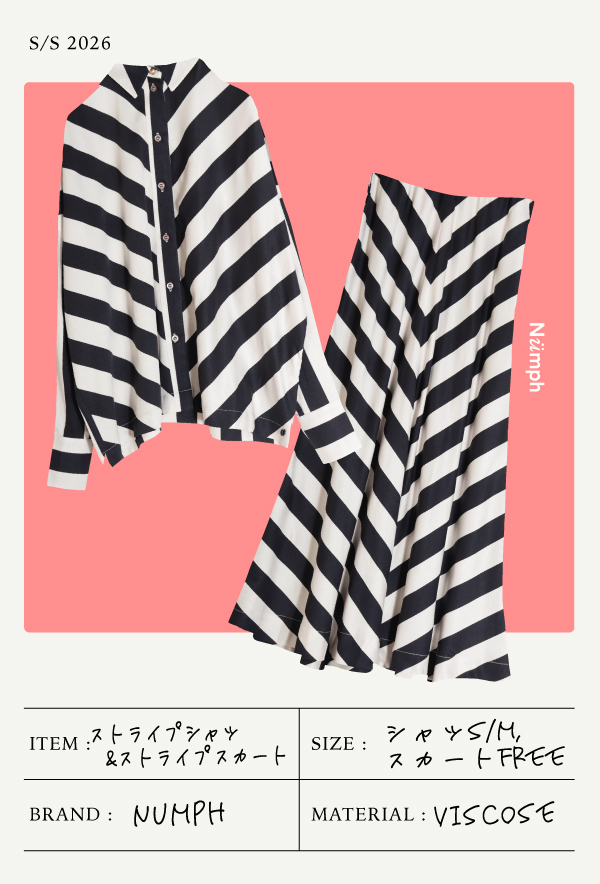 今季注目のストライプ柄のセットアップ。着やすいフラットなデザインながらも、バイアスに仕立てることで立体感のある表情と旬なムードを演出しています。幅広いコーディネートに着用でき、大人のカジュアルスタイルにもマッチするアイテムです。