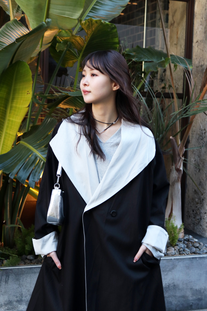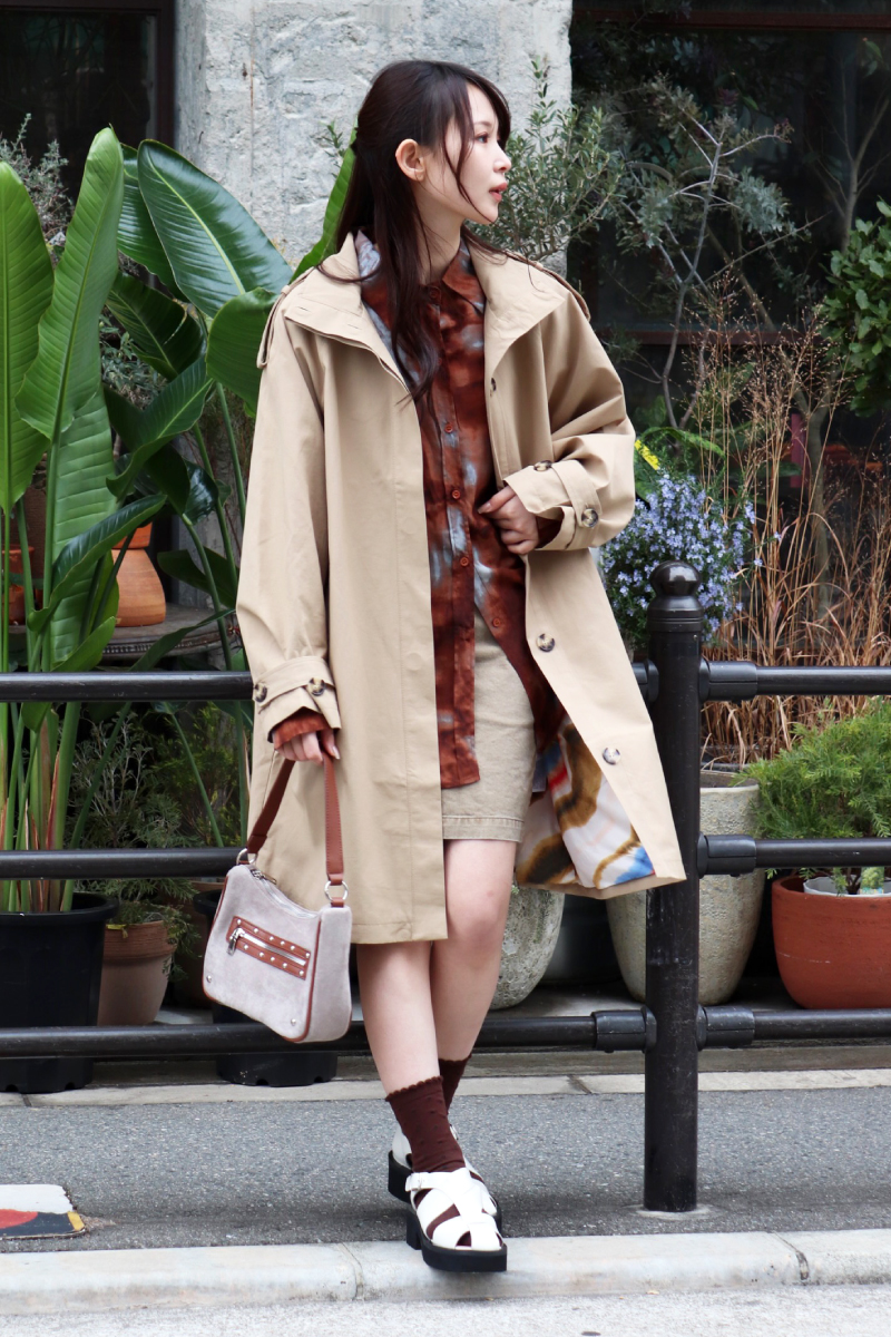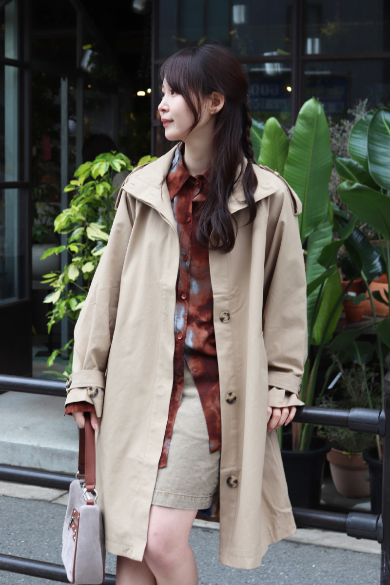 STYLING POINTキチンと感のあるトレンチ調のコートを同系色で馴染ませながらラフに着こなす。中のデザインは極力シンプルにすると色柄がアクセントとして引き立つ。