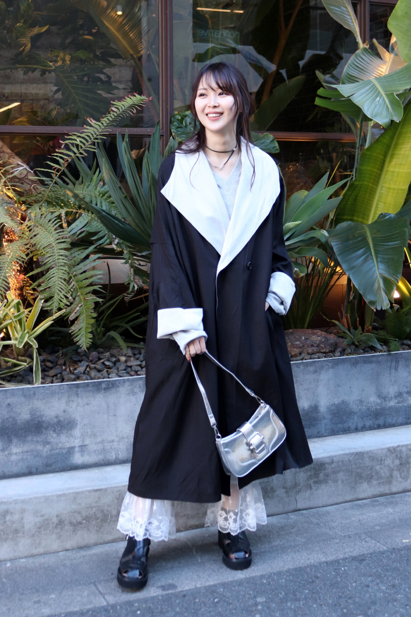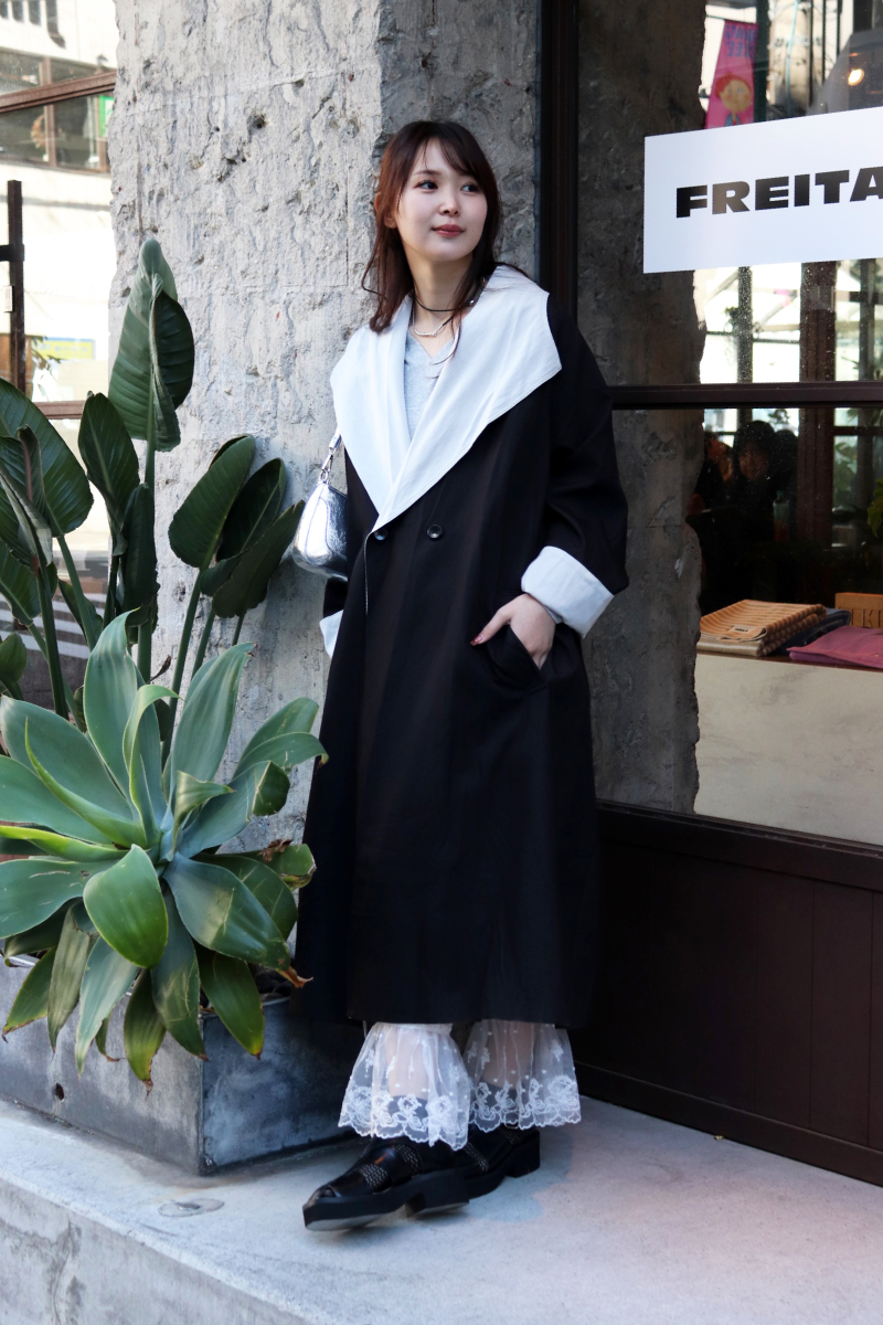 STYLING POINTロングコートの裾から覗かせるレースパンツ。ガーリーに傾きがちなスタイリングを無彩色でまとめてクラシカルに転換。