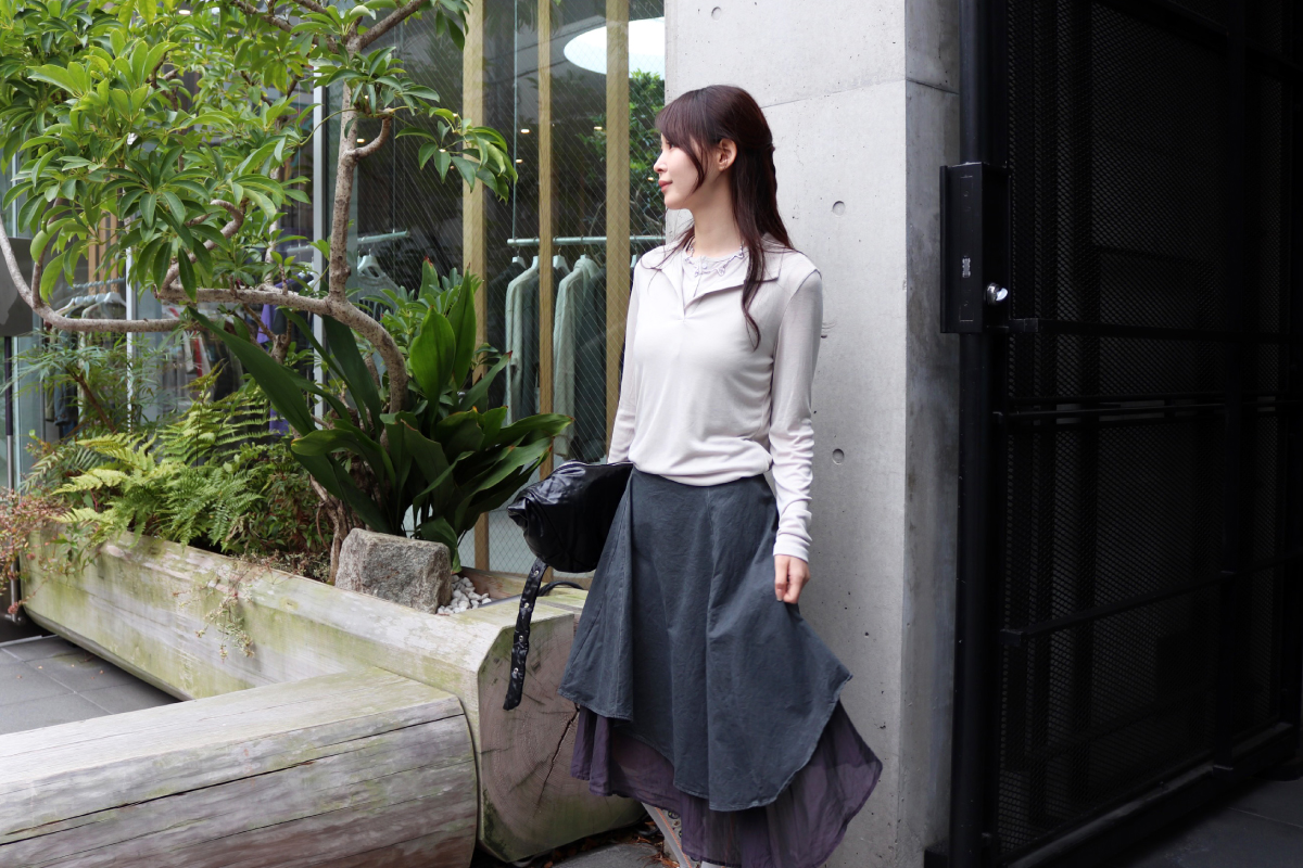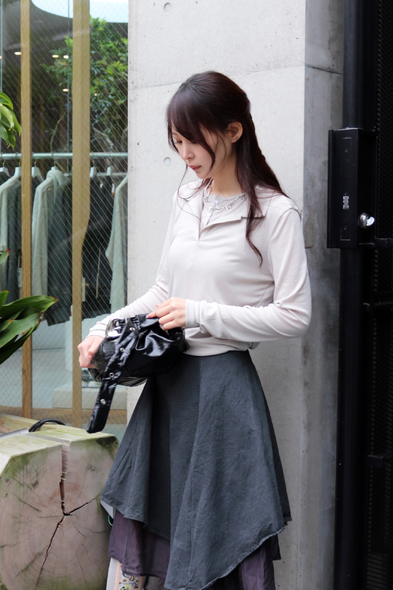 STYLING POINTポロ襟x膝丈スカートの正統派コーデを再考察。グレイッシュなトーン、レイヤードデザインを軸にすることで、さらに洗練された仕上がりに。