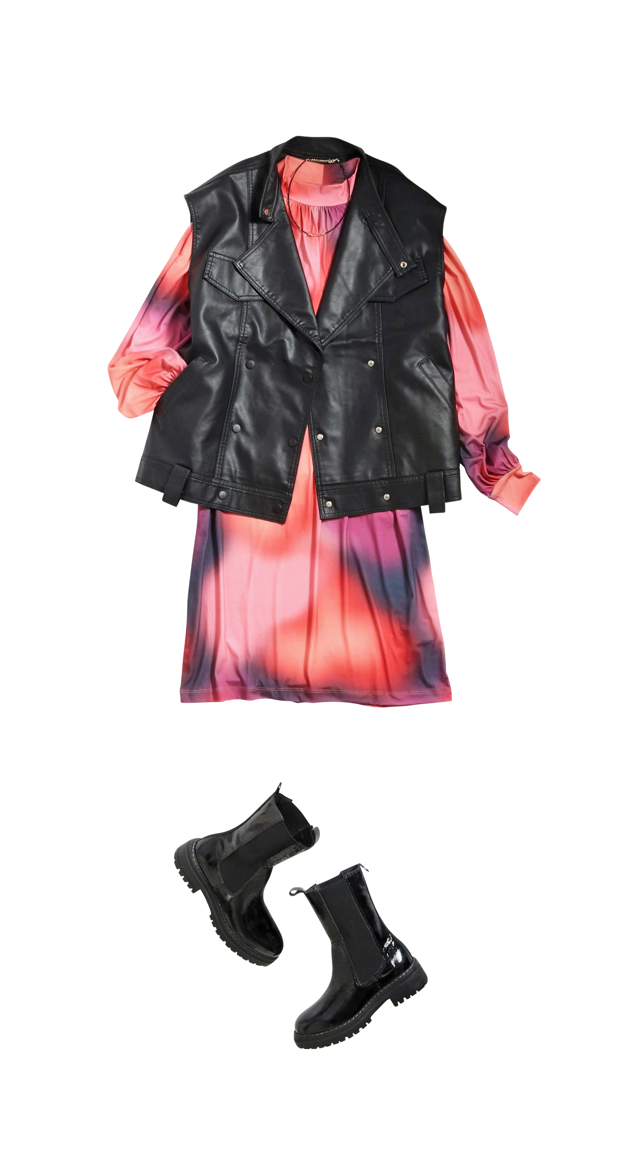 照れずに赤やピンクを取り入れたスタイルや