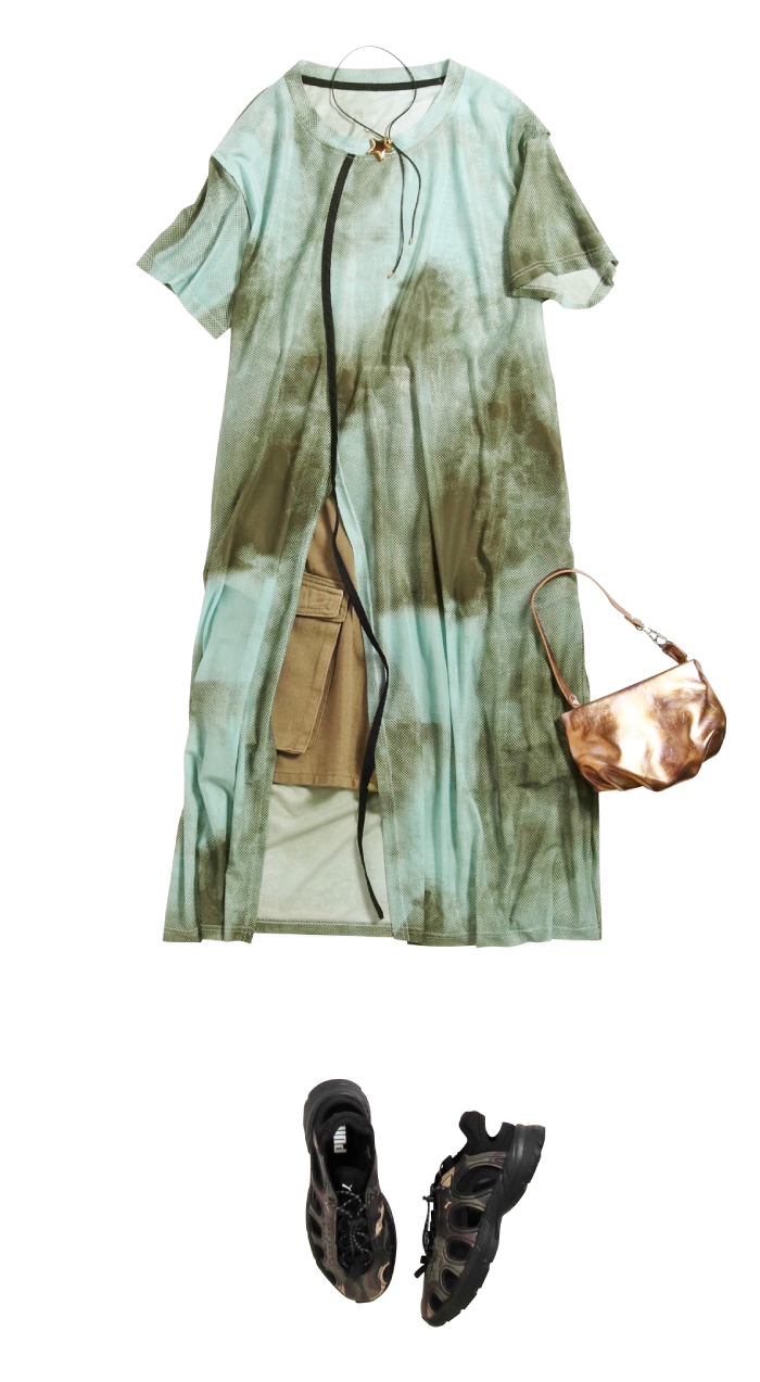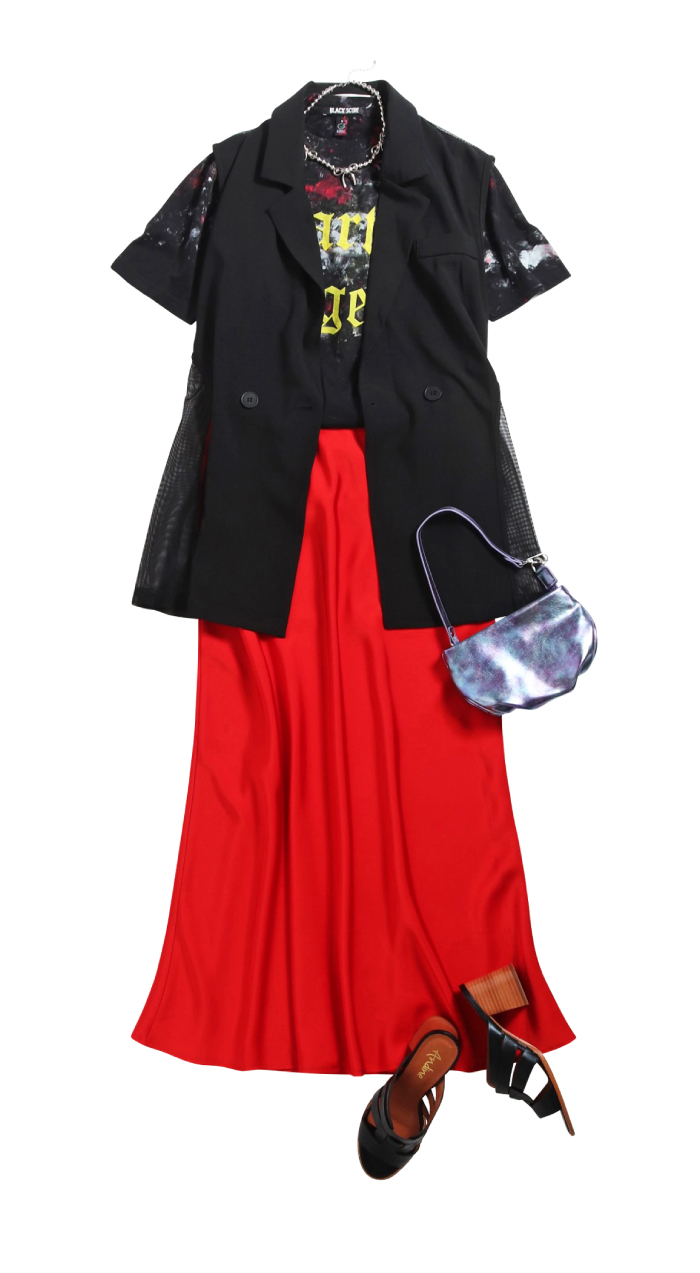 グラフィックTシャツに着映え効果叶うが光沢スカートを合わせてさらにシアーなベストをプラス。形はシンプルに旬な色と素材に挑戦することでカジュアルの大人見えに昇華。