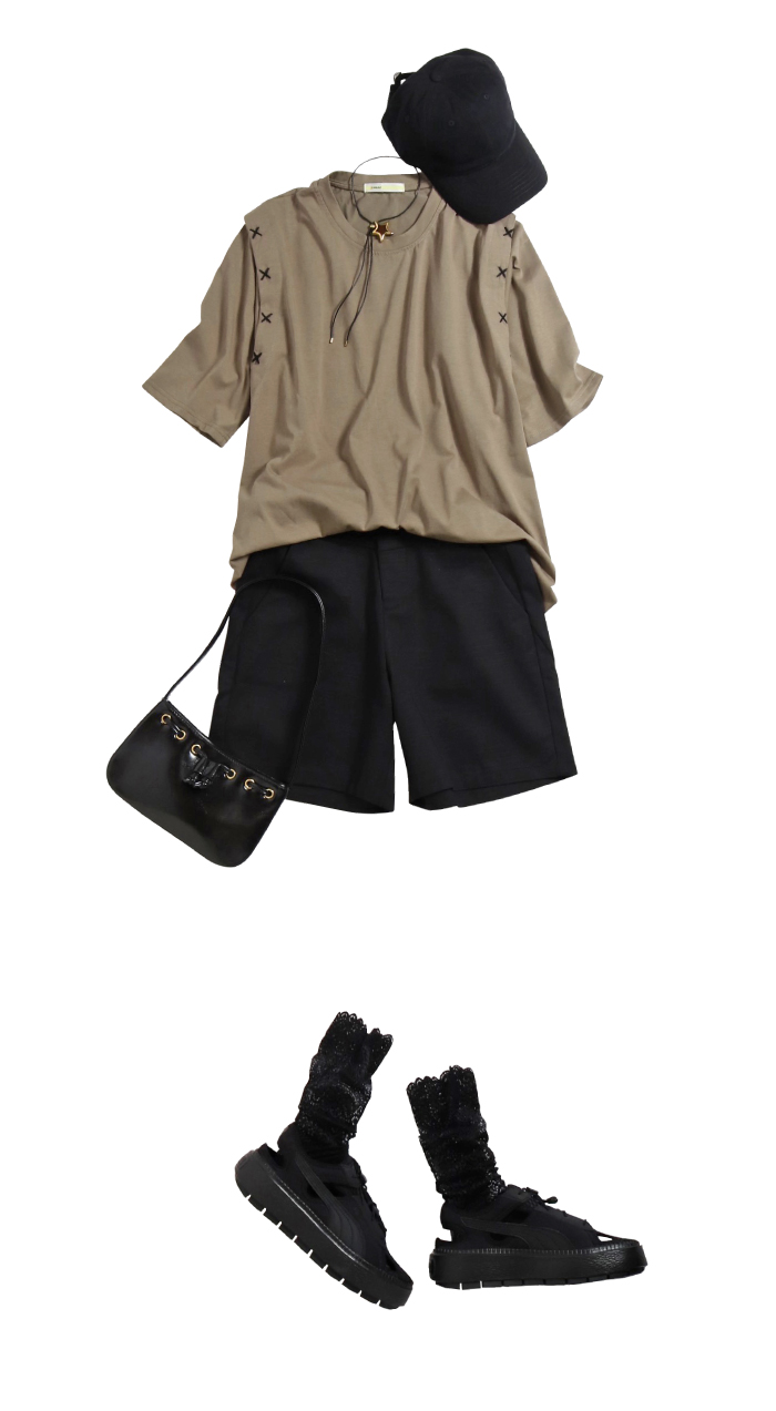 体を包むシルエットを頼りにフロントだけINして着崩し、ふんわりシルエットにするとボトムのコンパクトさが際立ちスッキリ見えに貢献◎ ボーイズテイストの小物を合わせてヘルシーに。