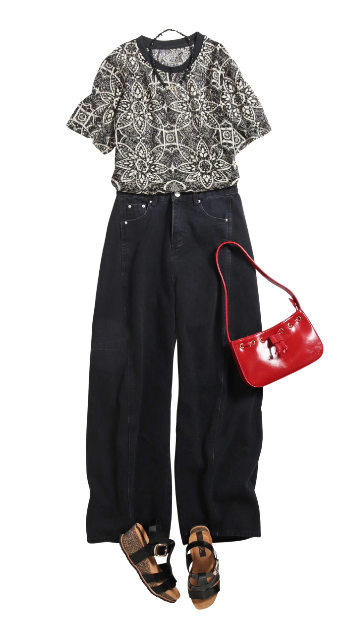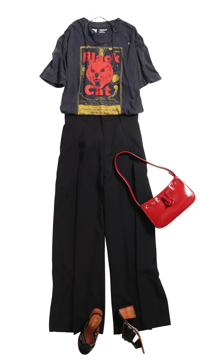 インパクトTシャツをモードなコーデに近づける、赤x黒の辛口配色。どちらも主張のある色だから小物はレディに纏めると好バランス。Tシャツの持つ風合いが「抜け」を生み、カドが取れ丸く治まる。