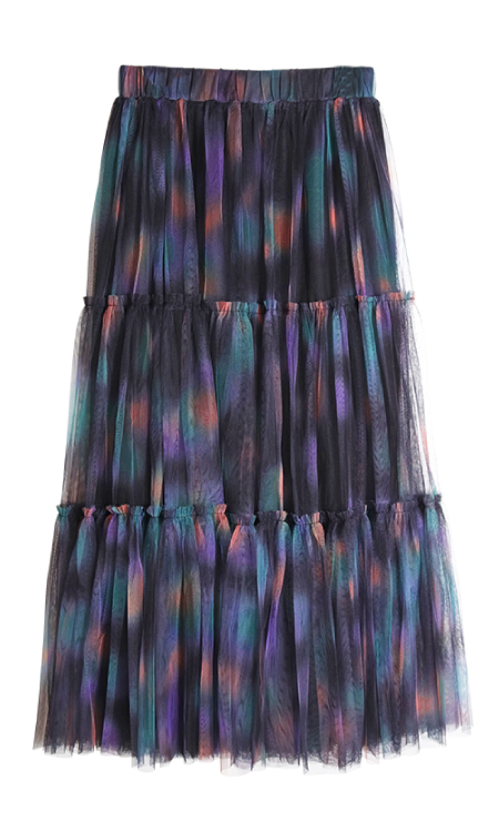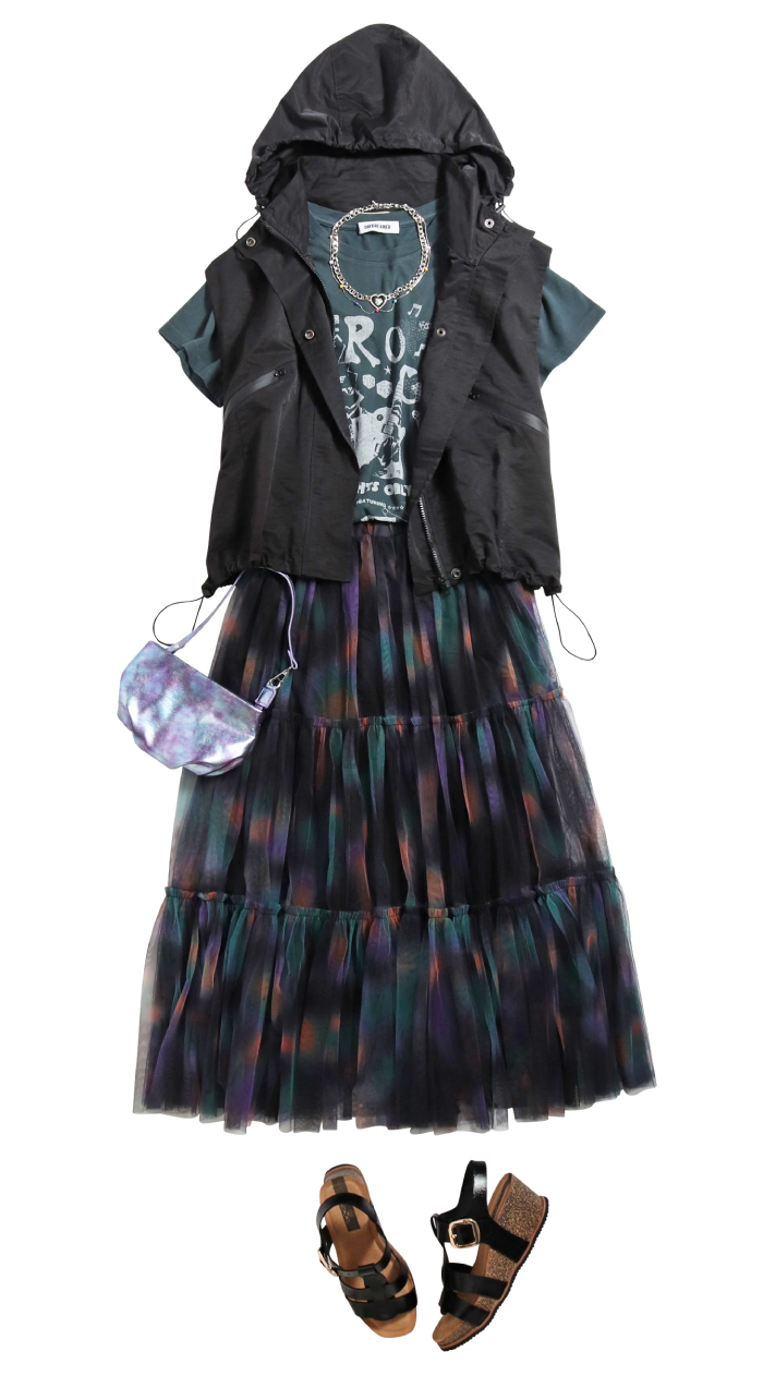 甘さのあるチュールスカートに無彩色のロックTEEをON。フードベストを投入してさらにアクティブな印象に。わかりやすいスポーティさが切れ味となりスタイリングが整います。素材のコントラストも効いた旬コーデ。