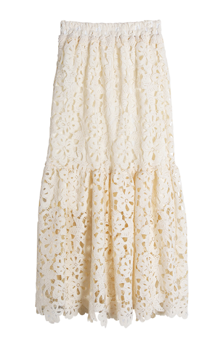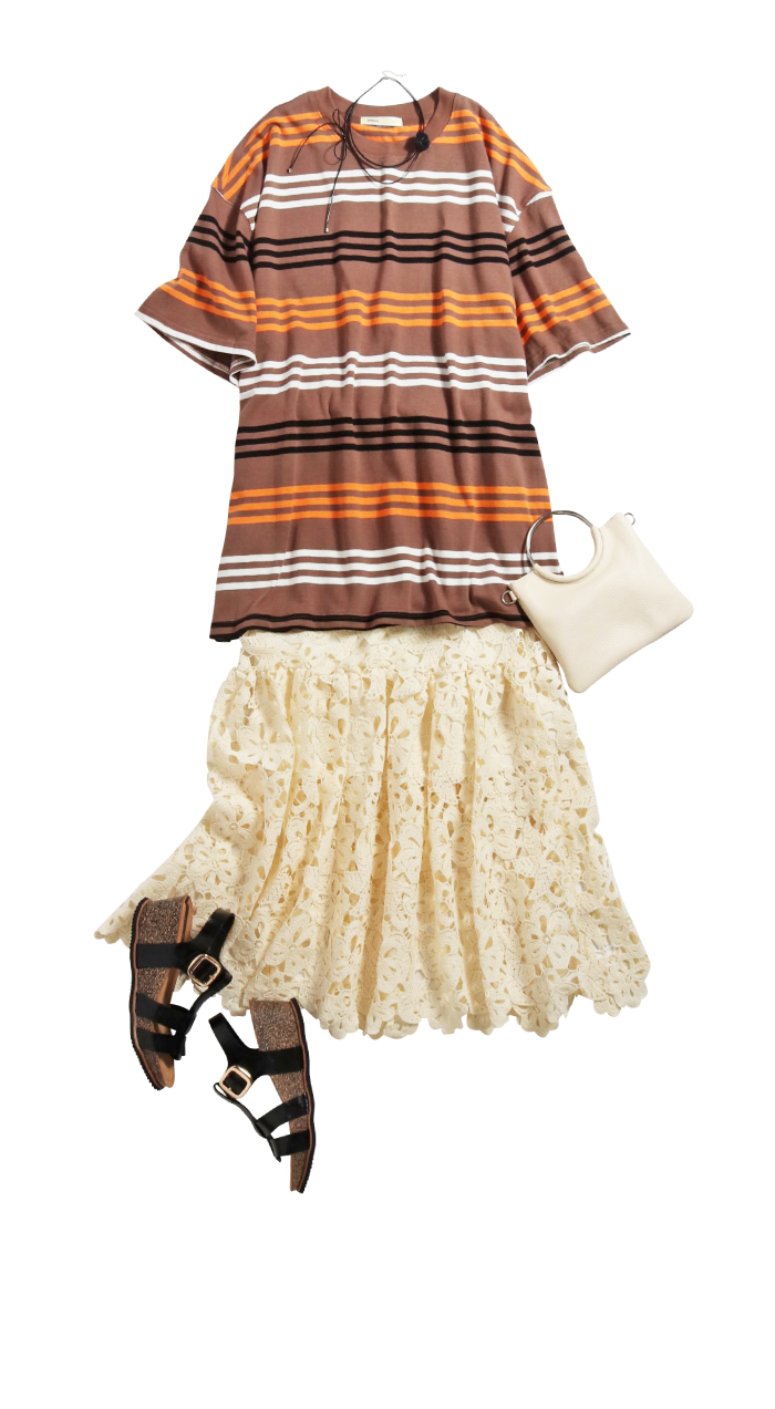 オーセンティックな印象のボーダーTシャツを「今」に引き寄せるなら、総レーススカートを合わ せてフェミニンムードがおススメ。レースの透け感も伴いほんのりセンシュアルな印象に。