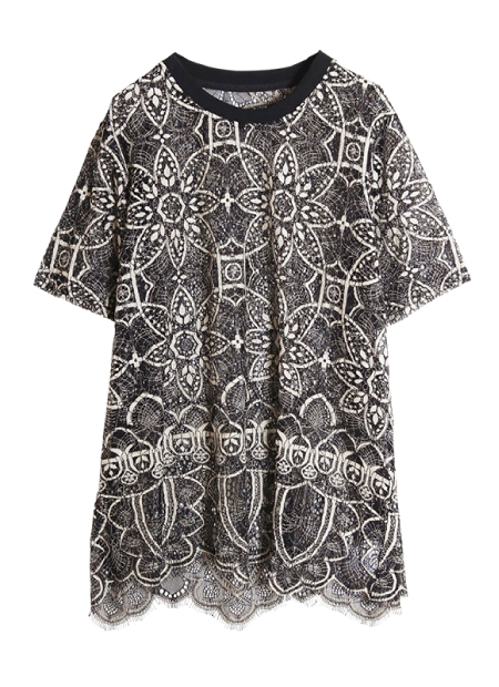 シックなモノトーン調の総レースTシャツ。