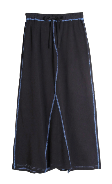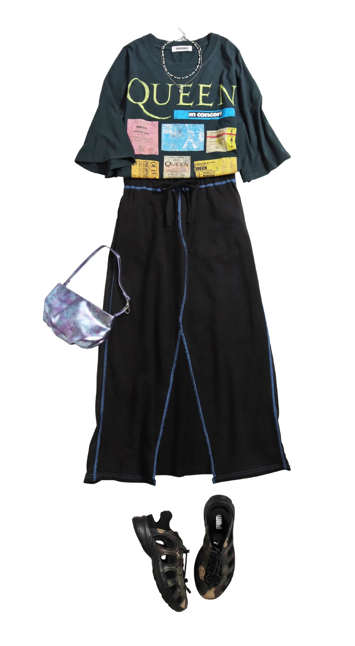 ロックTにトレンドのスポーティなロングスカートを合わせたカジュアル過ぎないストリートスタ イル。全体のトーンは合わせながら、素材感や小物でアクセントを足してさらに鮮度を上書き。