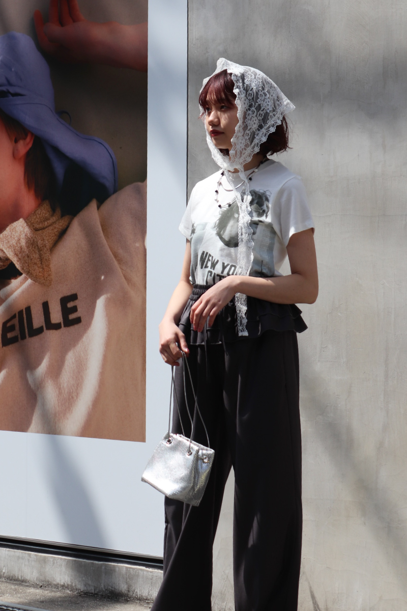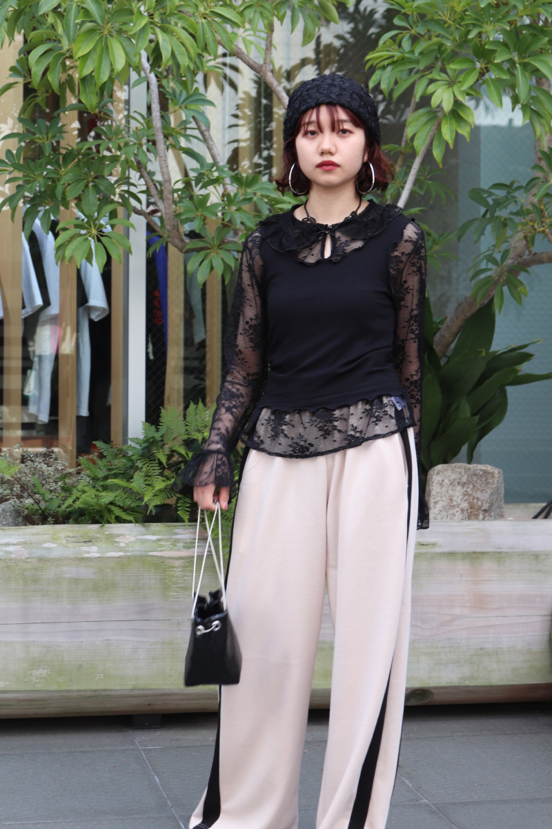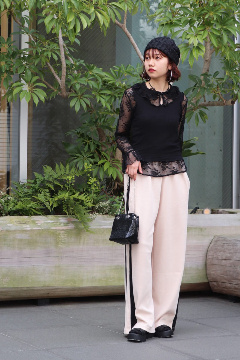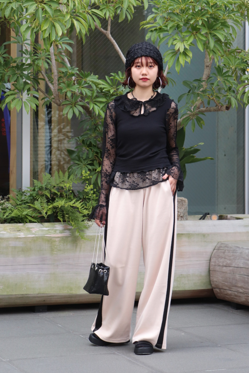 STYLING POINTレースのもたらす透け感をデイリーに着こなすには、リラクシーなスウェットパンツを味方にすると◎。ラフな要素がプラスされて、鮮度高めのコーデに昇華。