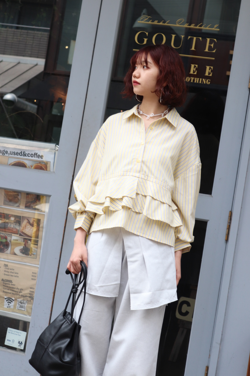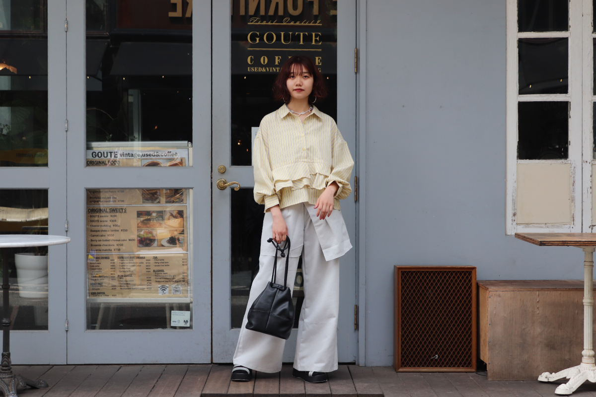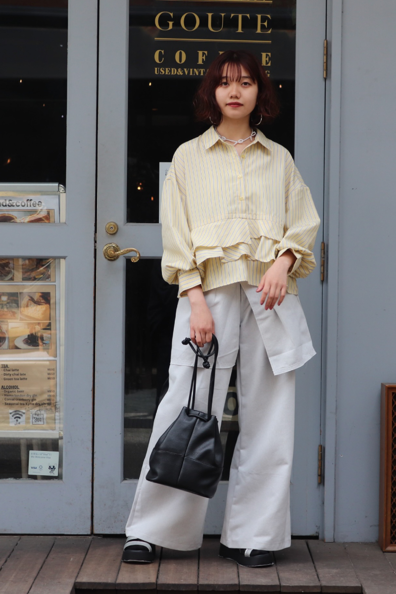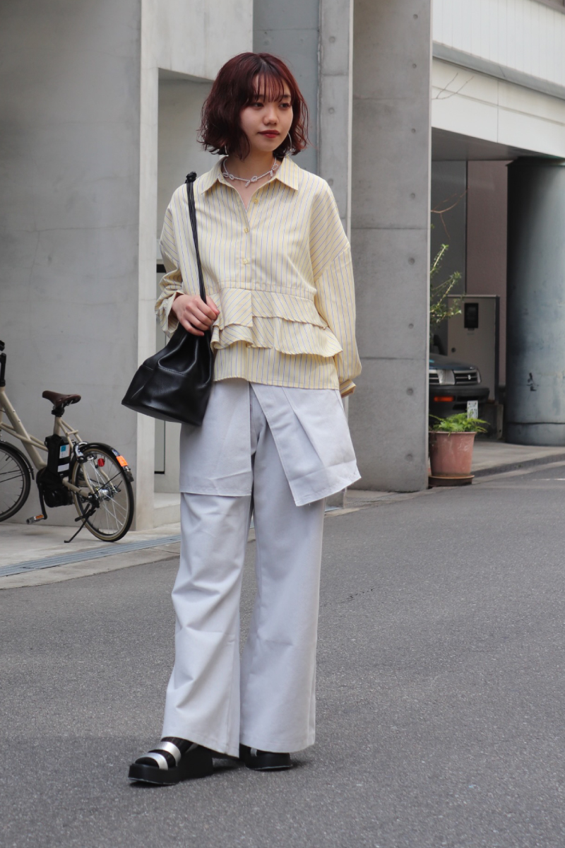STYLING POINT「甘さのあるストライプシャツ」をメインに、この春も必須のレイヤードデザインのパンツをON。可愛いにもカッコイイにも転べるおシャレ見えするコーデ。