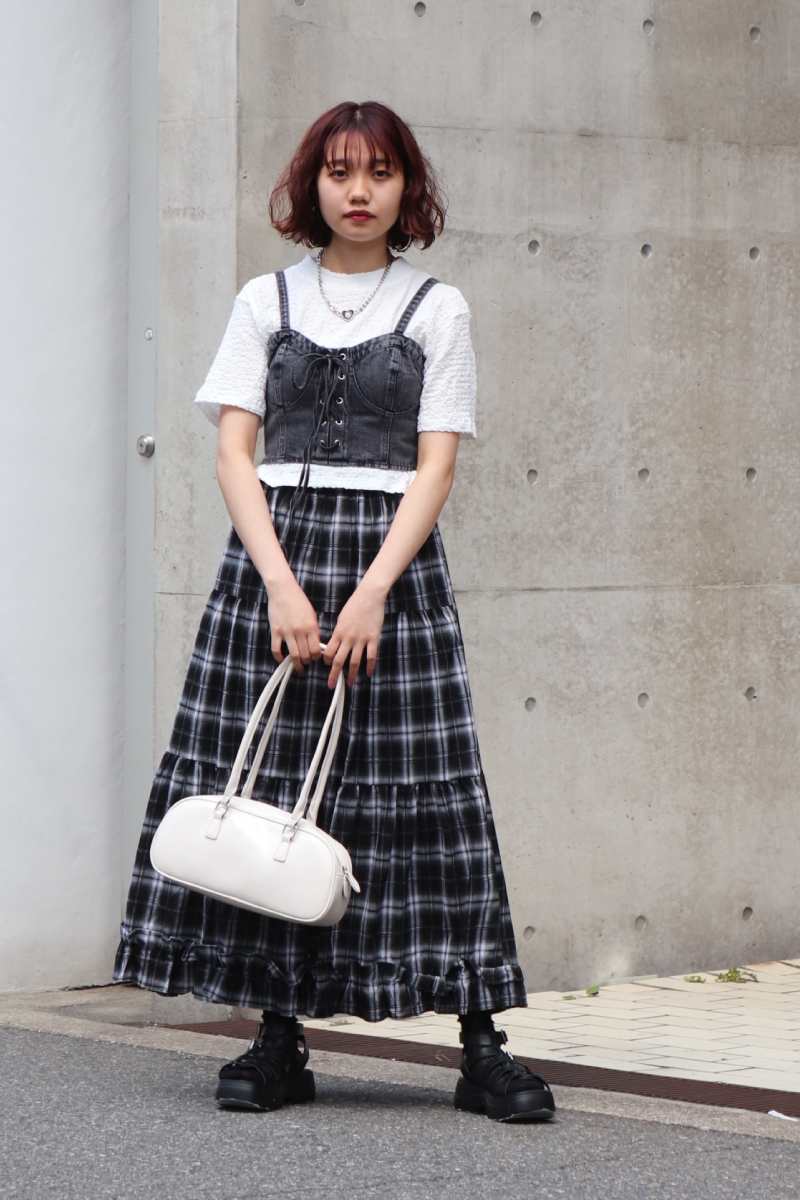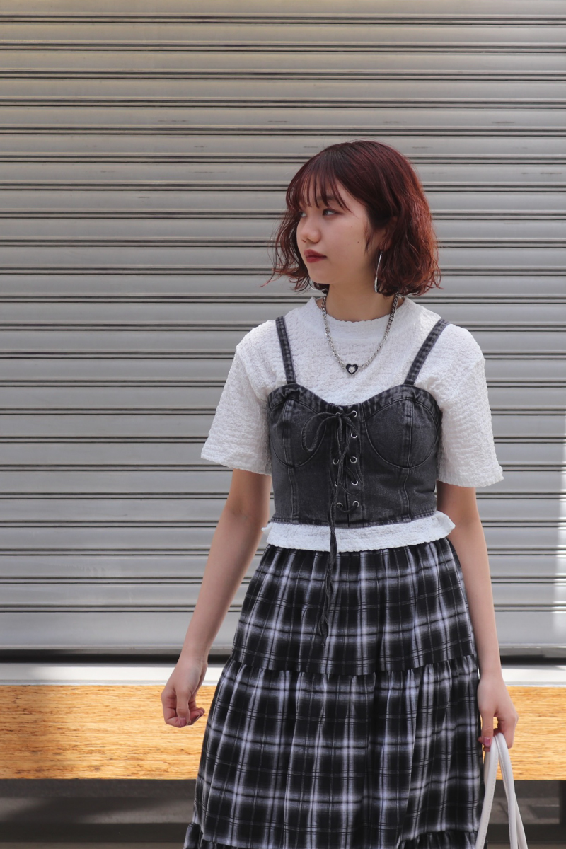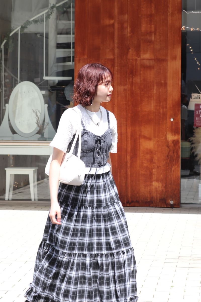 STYLING POINT白Tシャツ+チェック柄のロングスカートのもつ、クリーンな印象をくずすことなく、デニムビスチェで「適度な辛口」へ。垢抜けた印象に更新されて◎。