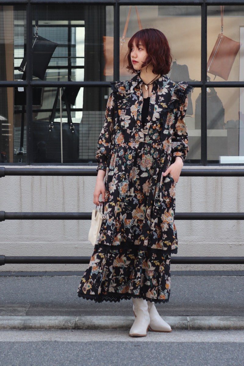 STYLING POINTワンピースの持つ華やかさと特別感をそのまま活かして1枚で着用。ウエスタンブーツを合わせて新しい表情を生み出す、今おススメのスタイリング。