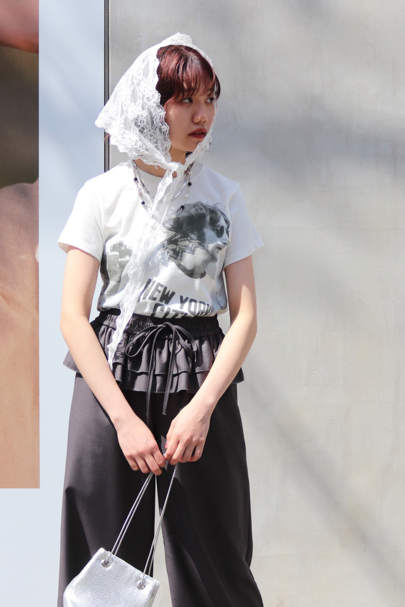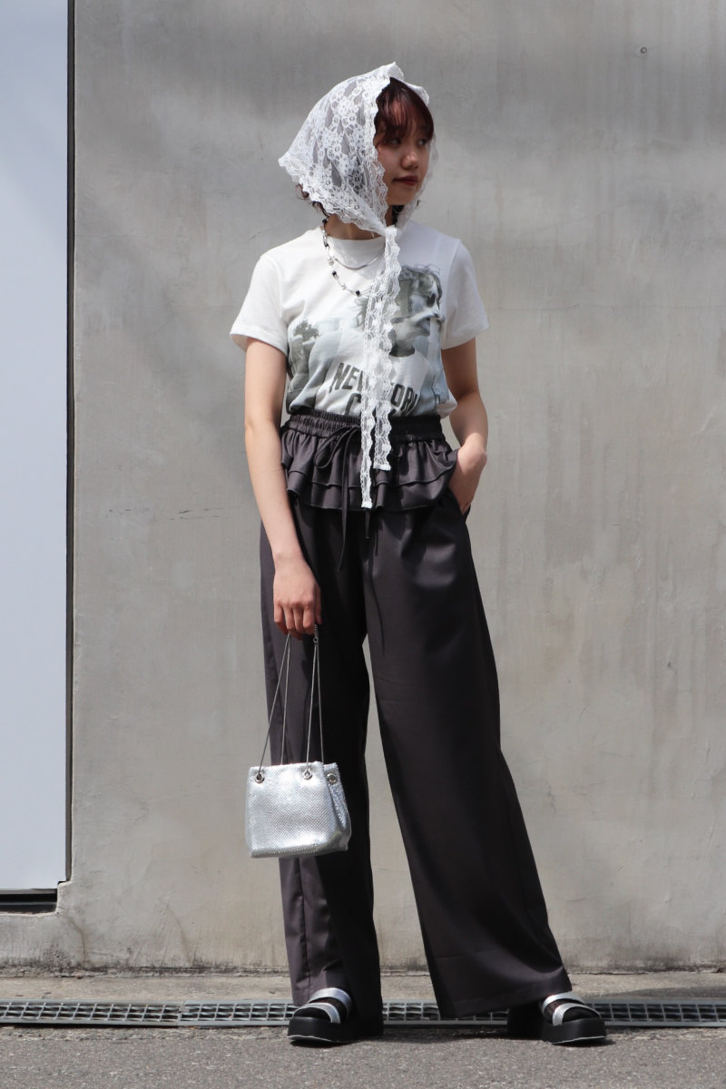 STYLING POINT夏の定番Tシャツコーデを最旬ムードに仕上げるのにピッタリな「目新しい」パンツ。フリルの甘さを抑えるグレーなら、大人っぽい「モード手前」のバランスに。