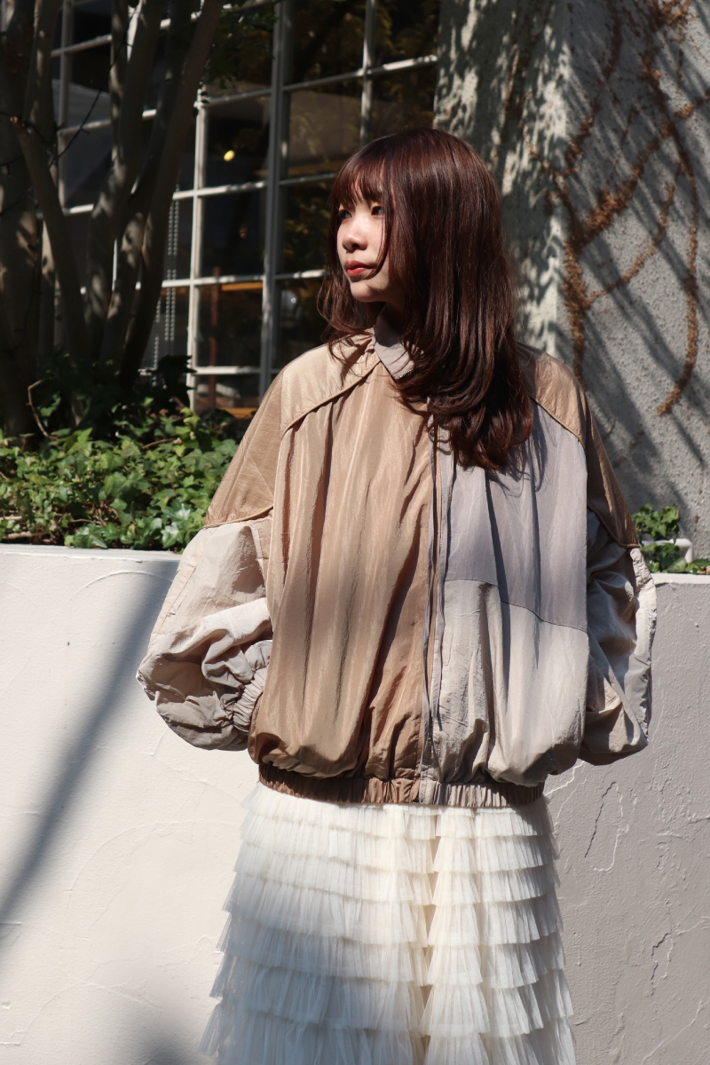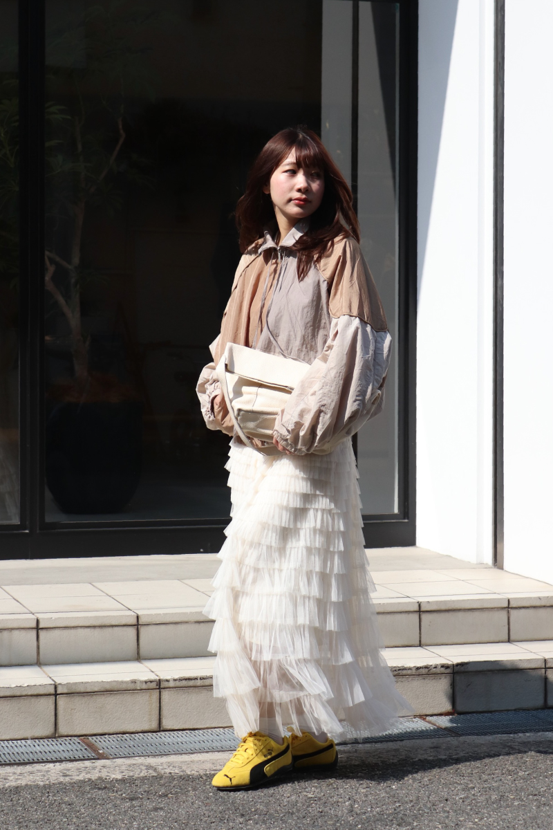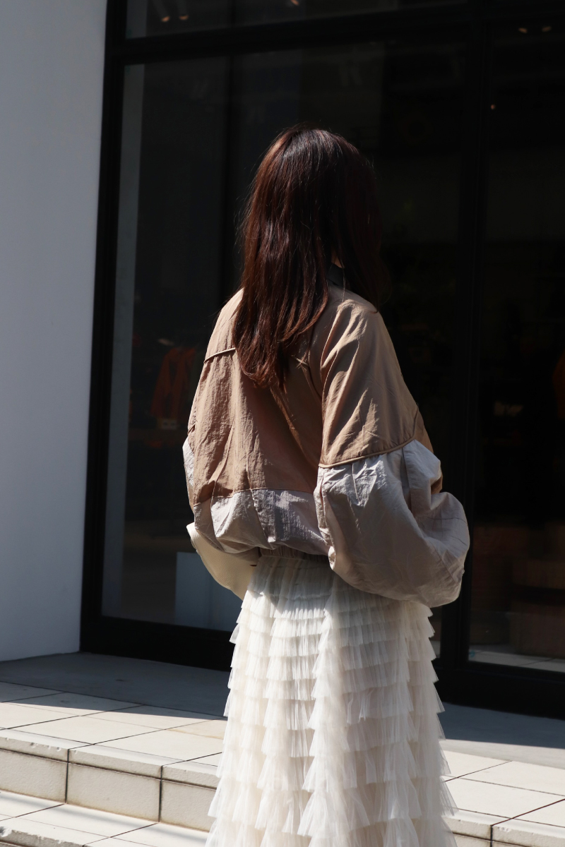 STYLING POINT細やかなフリルのチュールスカートを主役にスポーティなブルゾンを合わせる。対照的な要素をミックスした「ラブリーxスポーティ」コーデ。