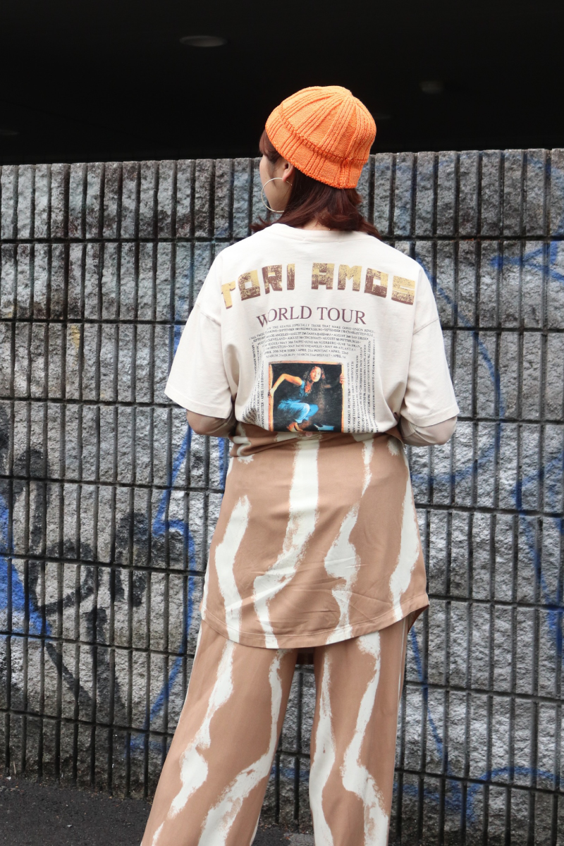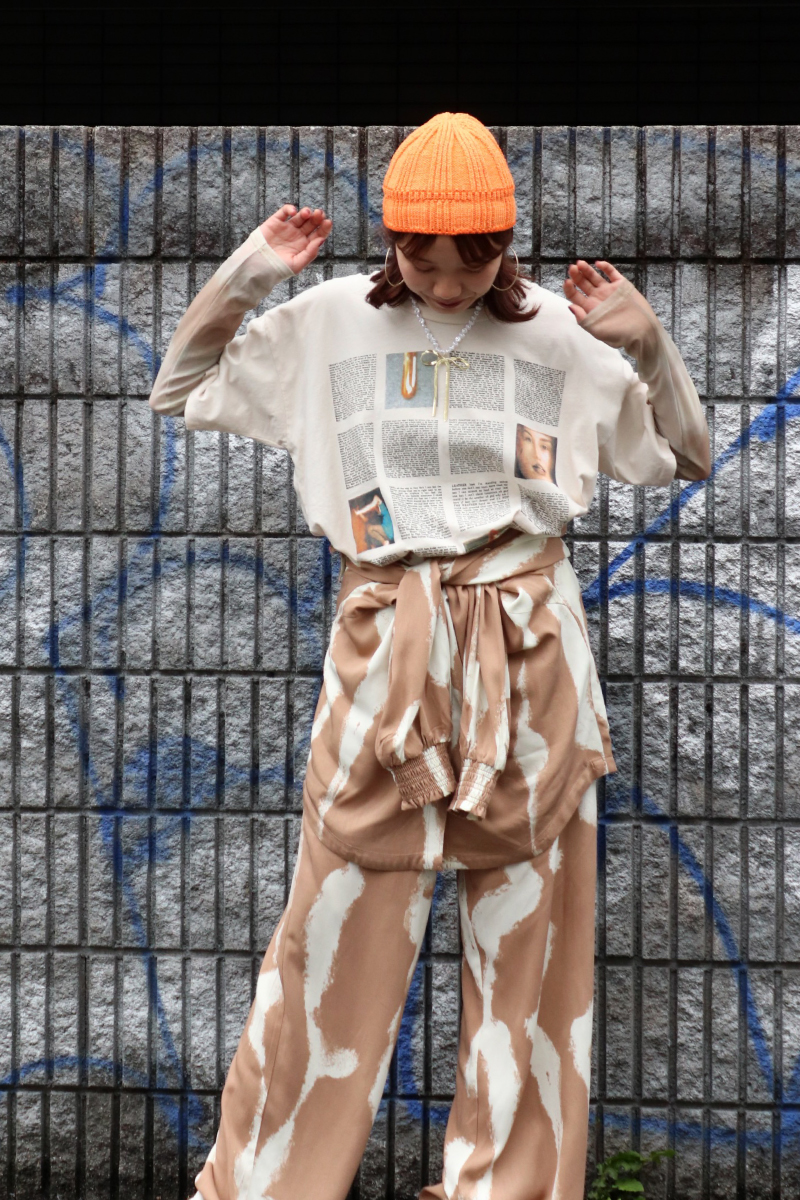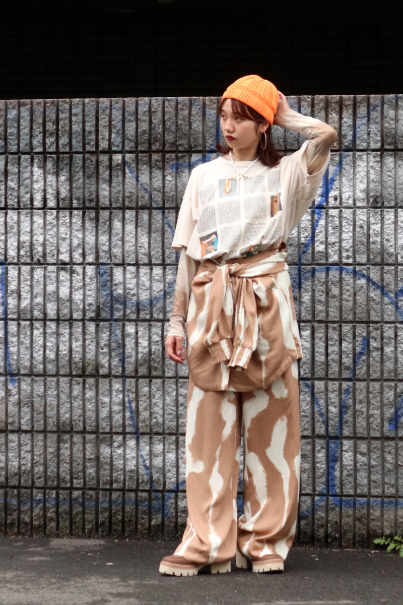 STYLING POINT同柄のシャツとパンツのセットアップ。シャツを腰巻してスカパン風にすると、より幅広いコーディネートを楽しめます。Tシャツでカジュアルダウンした「こなれ感」も今っぽい。