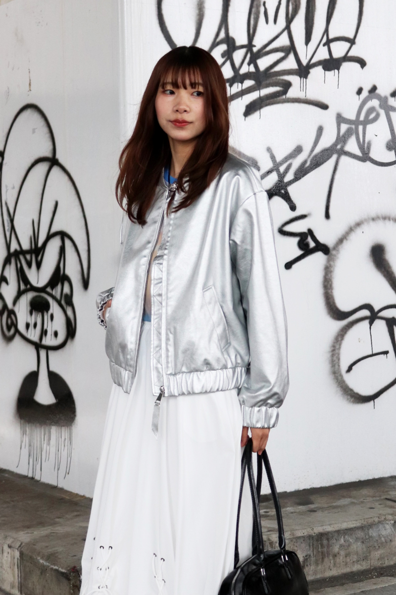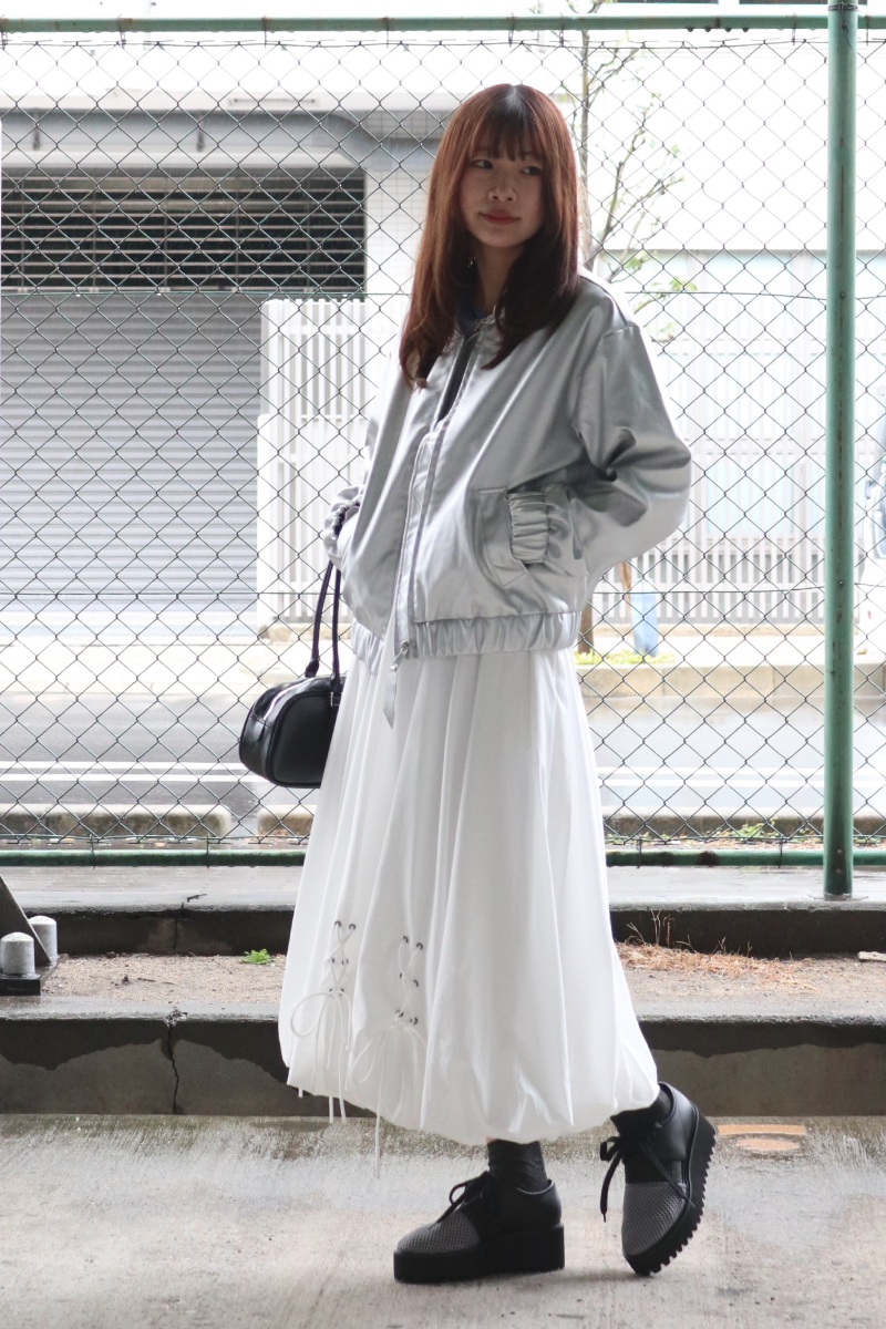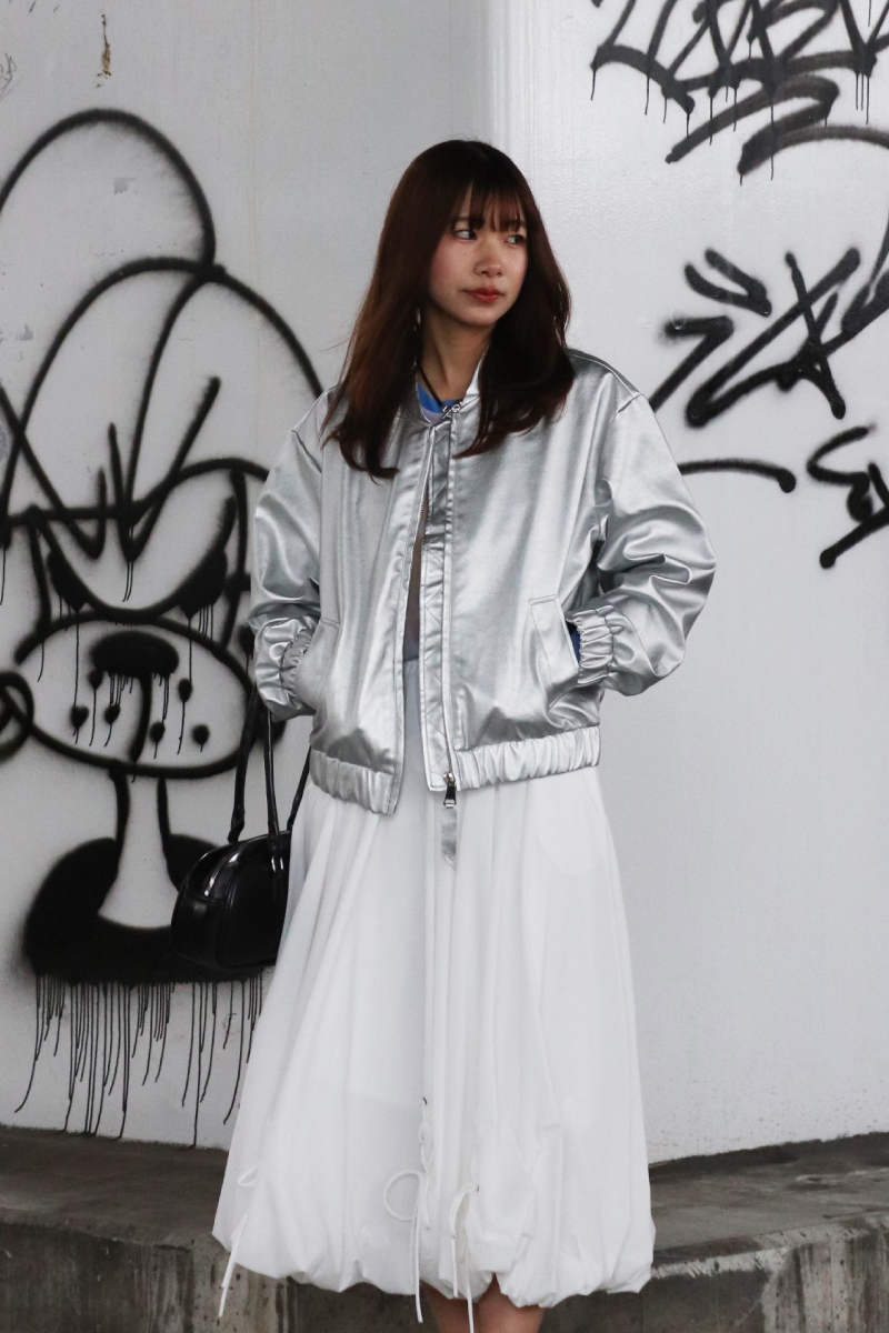 STYLING POINTコーデに映えるシルバーのアウターには無彩色/白が好相性!コンパクトな着丈のブルゾンにボリューミィなバルーンスカートで、シルエットにメリハリを効かすとさらに◎